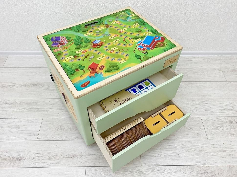Выдвижные модули содержат дидактические игры и обучающие материалы по теме ПДД. Это пошаговая настольная игра, магнитно-маркерная доска с дорожными знаками, пазл «Экстренные службы» и развивающая сенсорная панель с элементами Монтессори и магнитным лабиринтом.