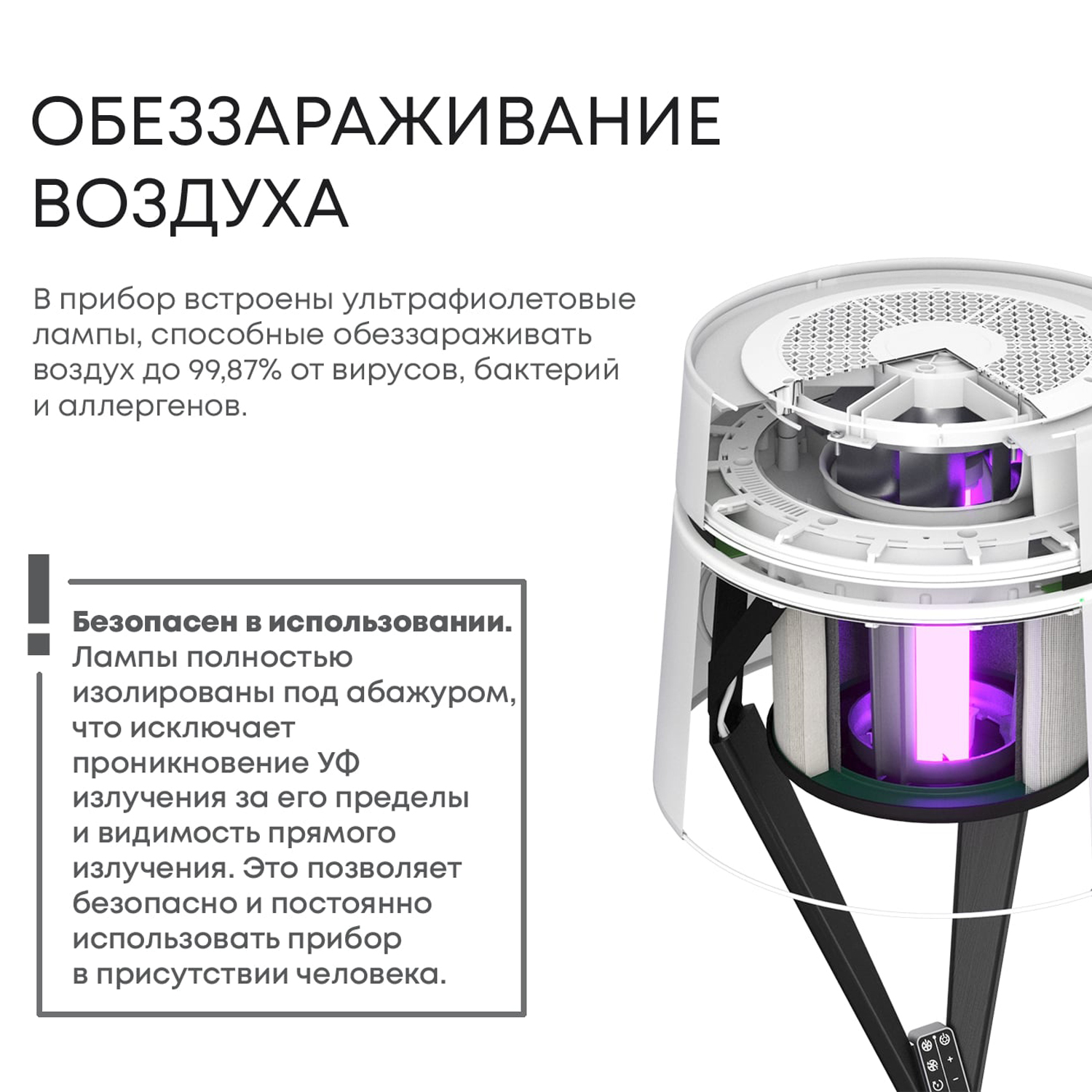 В прибор встроены ультрафиолетовые лампы (UV-C или UV-A), способные обеззараживать воздух до 99,87% от вирусов, бактерий и аллергенов.