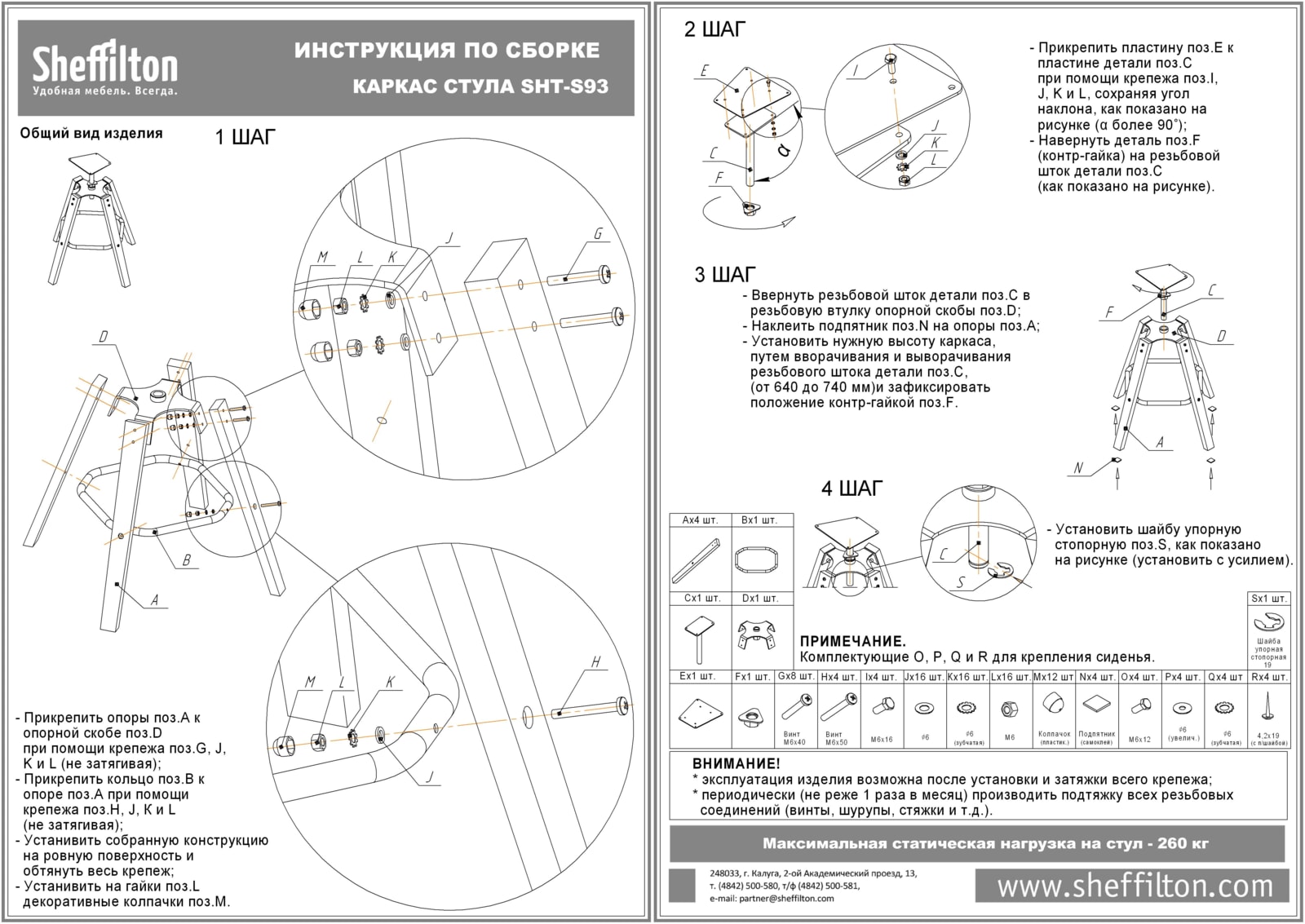 СПЕЦИАЛЬНЫЕ ПОДПЯТНИКИ каркаса обеспечивают защиту покрытия от царапин и повышают устойчивость стула. К каркасу приложен комплект крепежа и схема сборки.