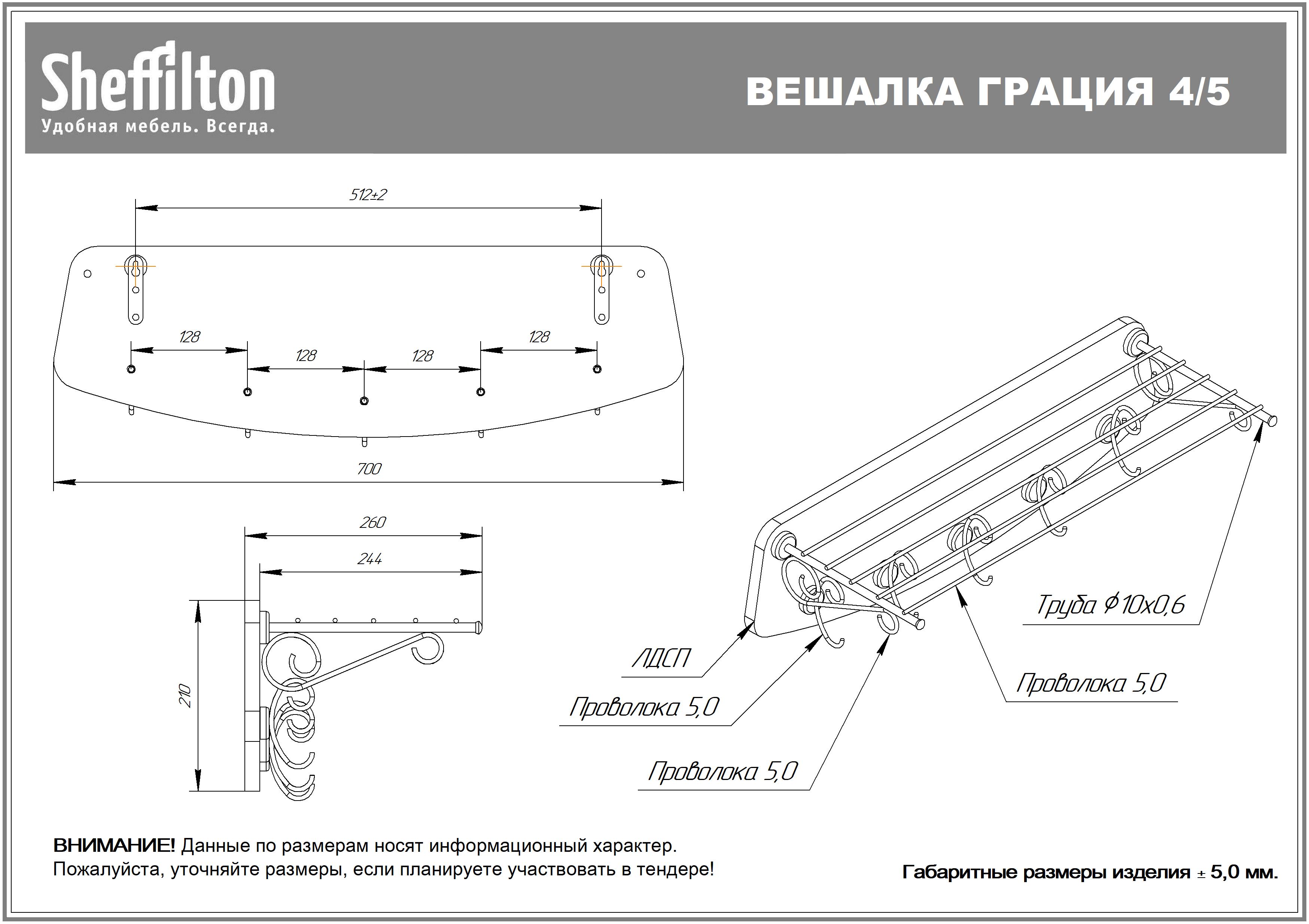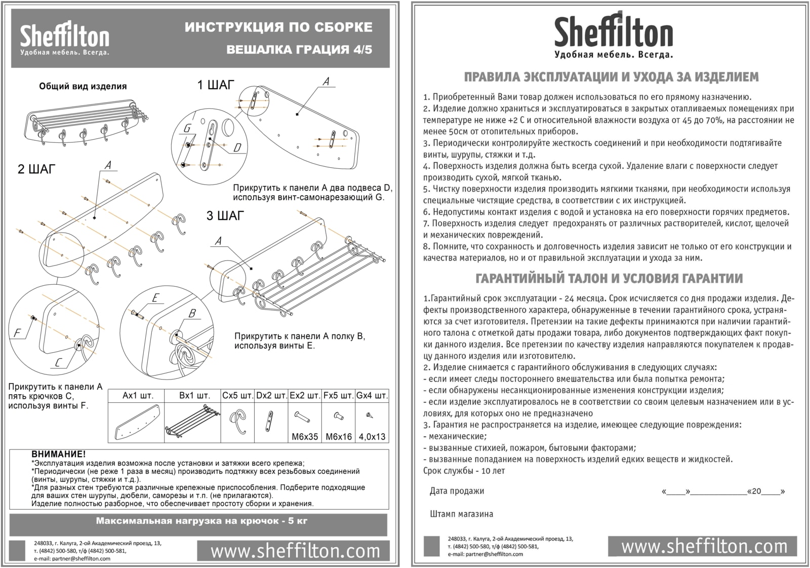 Максимальная распределенная статическая нагрузка на крючок - 5 кг, на полку - 5 кг.