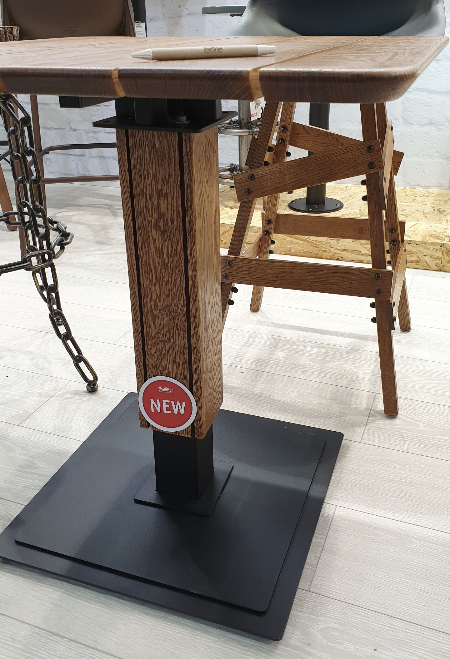 - Основание выполнено из металла и отдекорированно пластинами из натурального "брашированного" дуба (эффект искусственного старения)