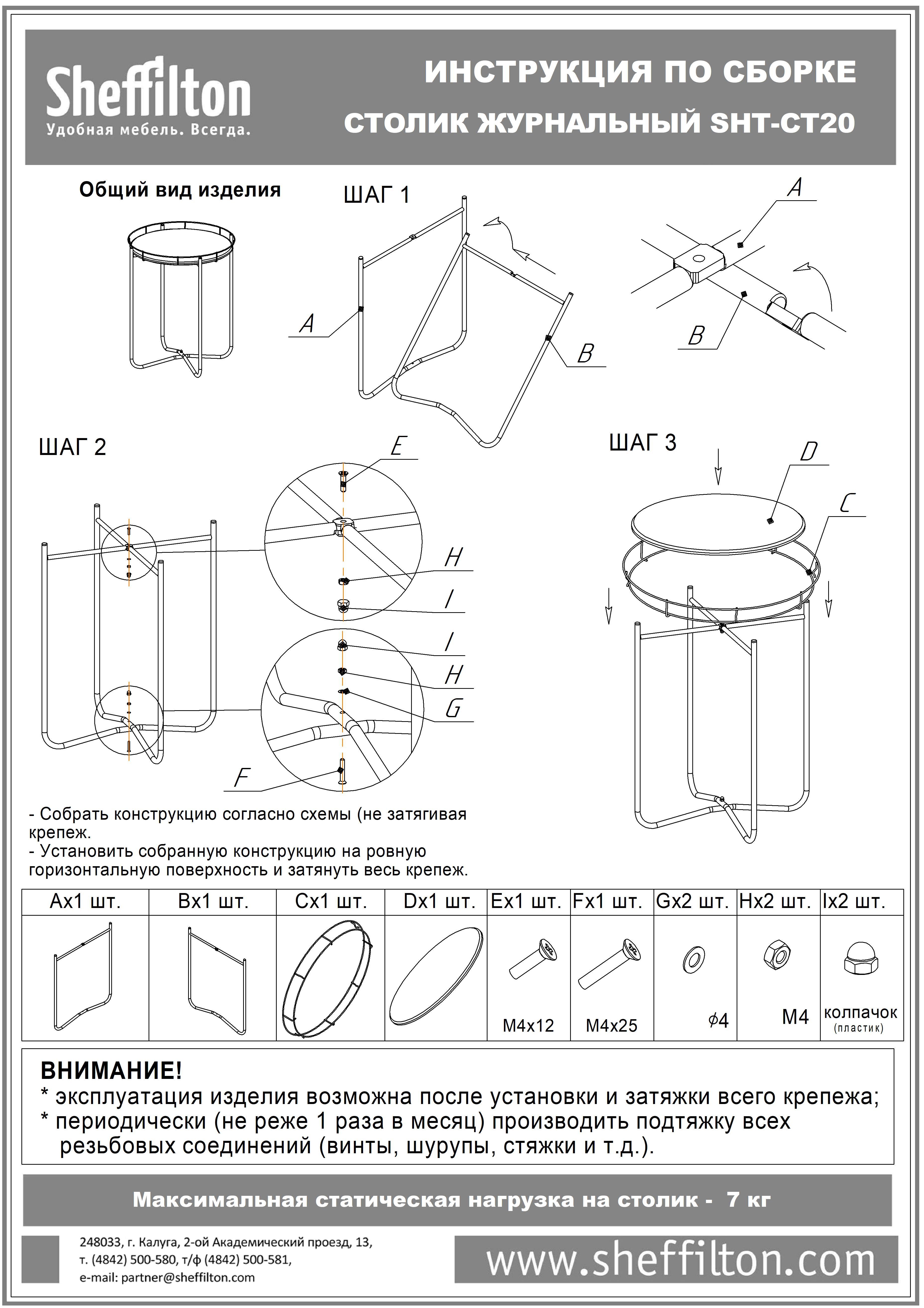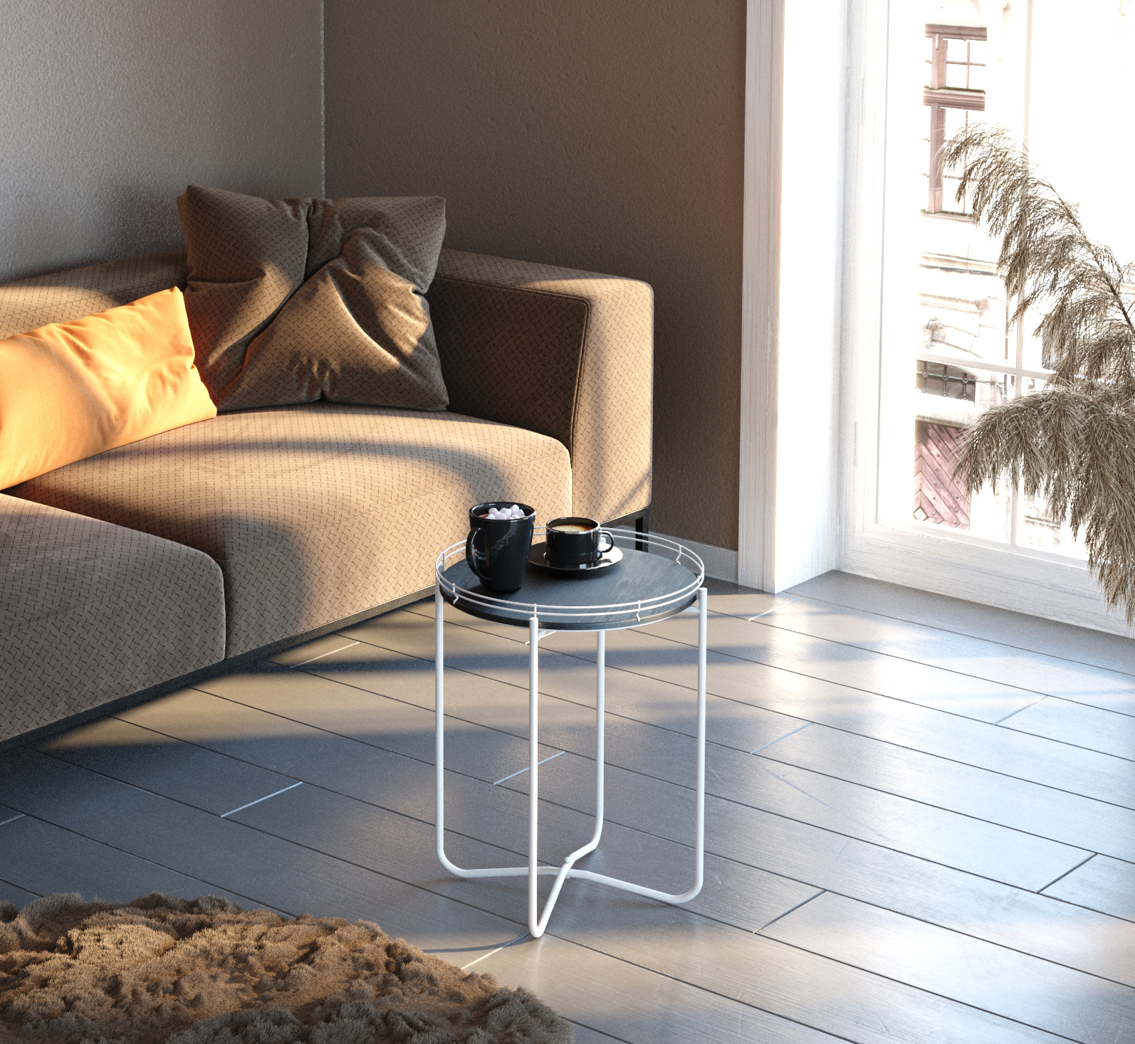 Металлический каркас окрашен порошковой краской, устойчивой к механическому воздействию. Столешница выполнена из МДФ с декоративным узором под мрамор. Максимальная статическая нагрузка на столик 7 кг.