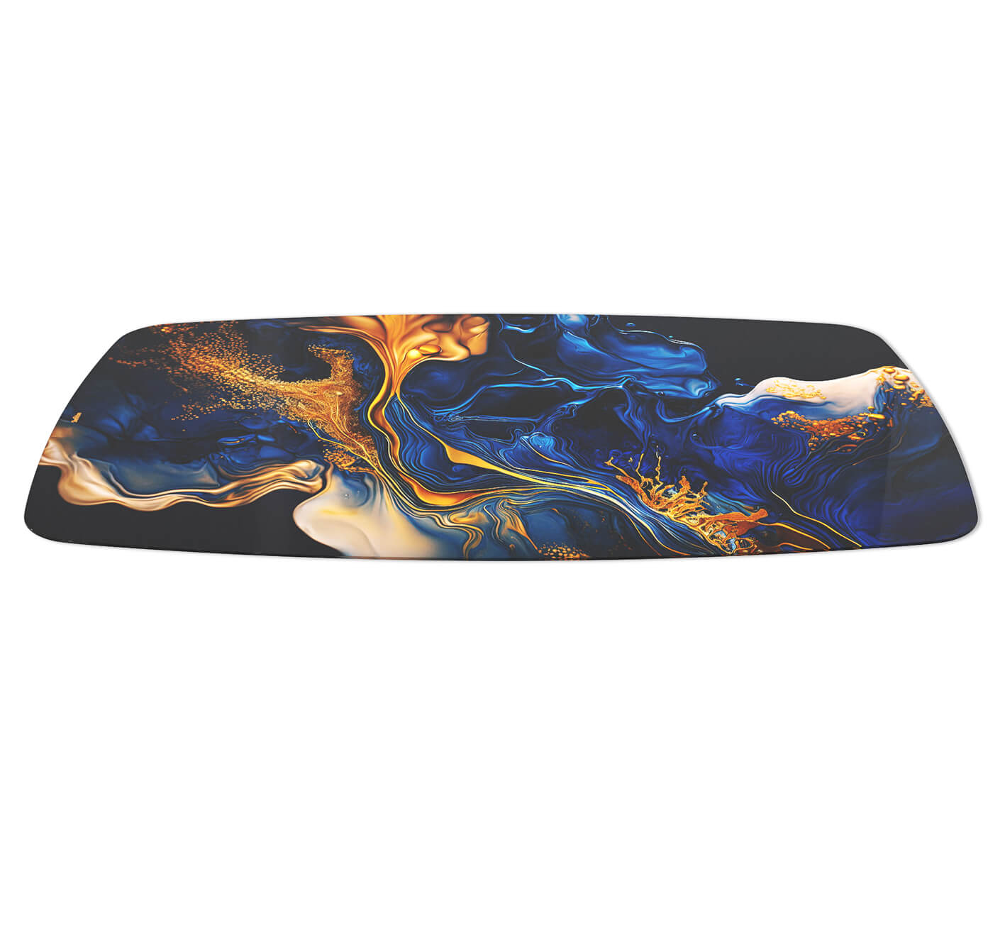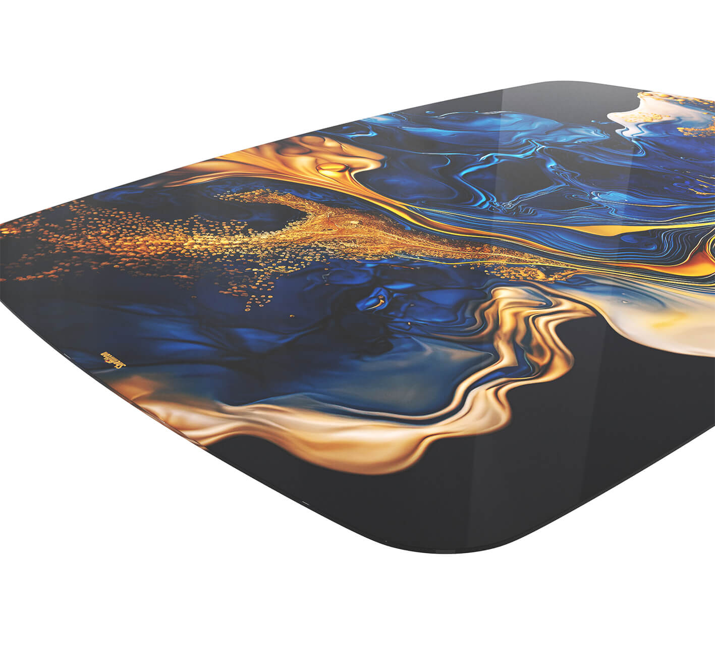 Столешница выполнена из закаленного стекла с ультрафиолетовой печатью. Одним из главных преимуществ закаленного стекла является его стойкость к высоким температурам, вибрационным нагрузкам, ударам и царапинам. Также стекло обладает высокой ударной вязкостью - энергия от столкновения с бьющим предметом распределяется относительно продолжительное время (по сравнению с обычным стеклом), что приводит к разрушению на очень мелкие осколки. Стекло закреплено на МДФ с отступом 50 мм.