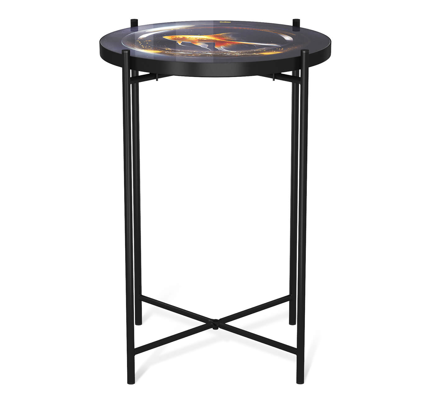 Столешница выполнена из закаленного стекла с ультрафиолетовой печатью. Закаленное стекло разбить случайно практически невозможно. Кромка столешницы обработана для абсолютно безопасного использования. Металлический каркас окрашен порошковой краской, устойчивой к механическому воздействию. Выполнен из трубы 12 мм и металлического листа. Диаметр столешницы 350 мм.