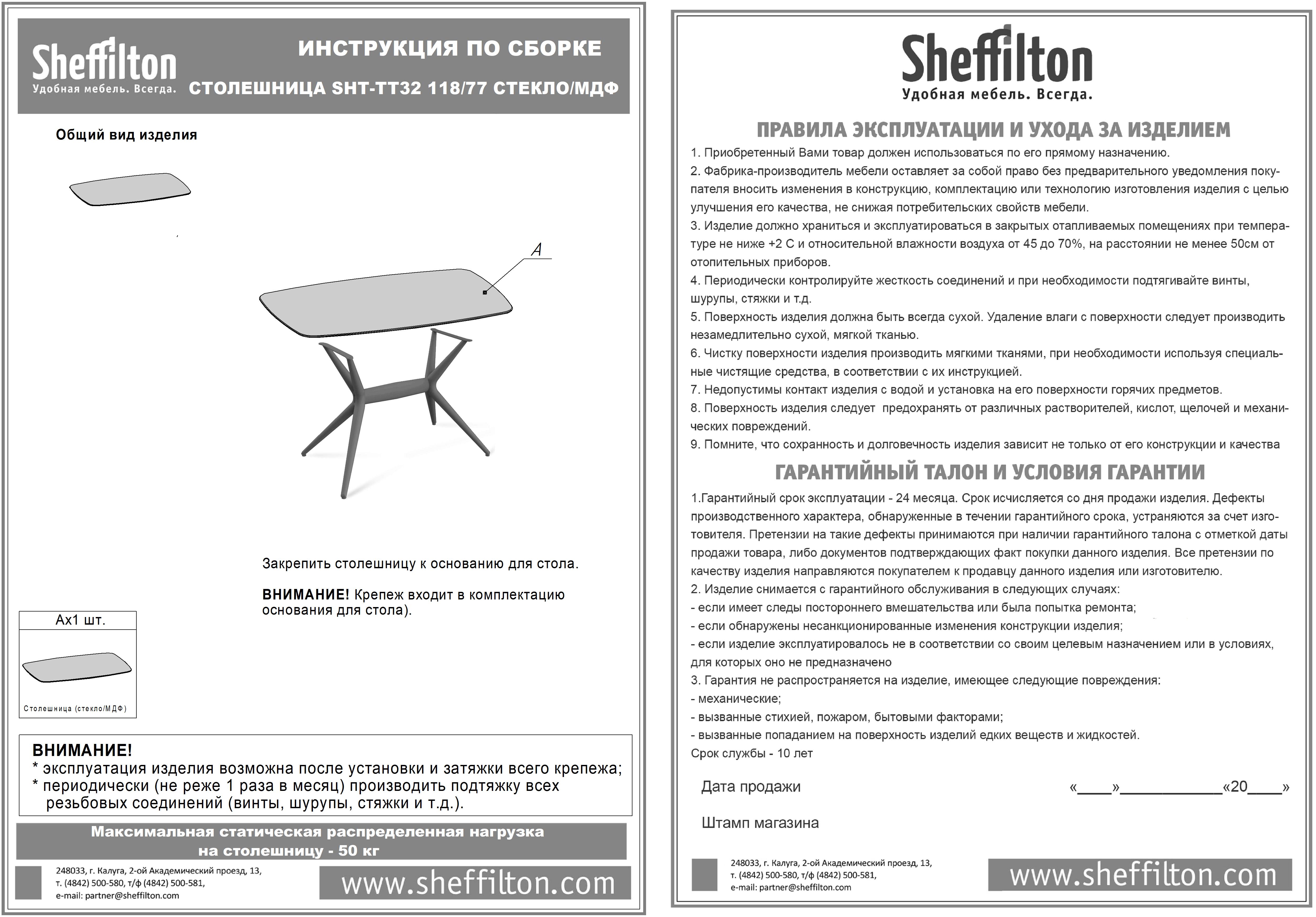 Максимальная нагрузка на столешницу – 50 кг.