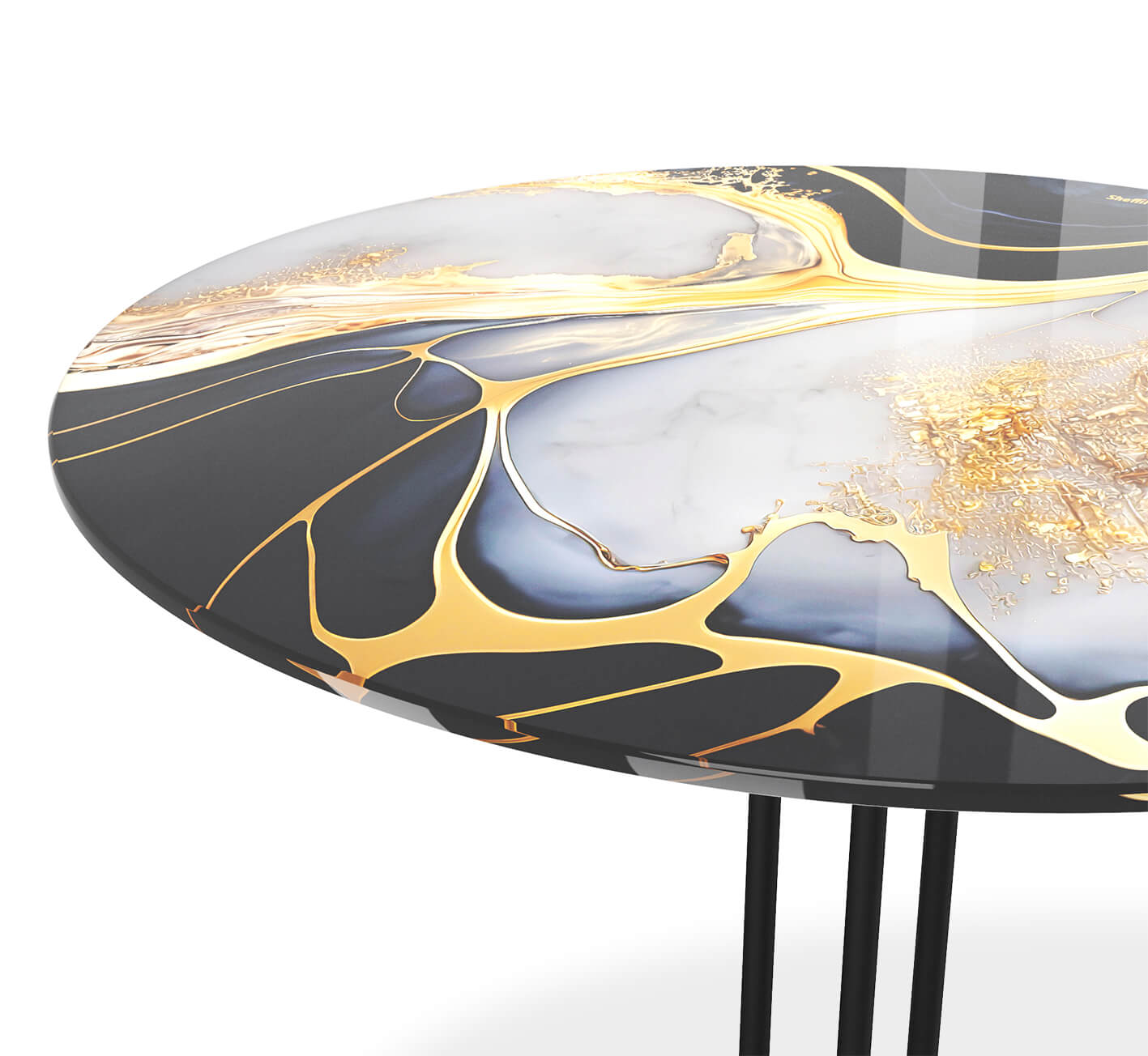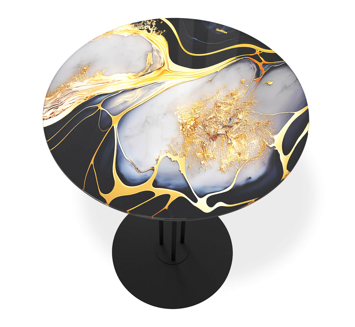 Столешница выполнена из закаленного стекла с ультрафиолетовой печатью. Одним из главных преимуществ закаленного стекла является его стойкость к высоким температурам, вибрационным нагрузкам, ударам и царапинам. Также стекло обладает высокой ударной вязкостью - энергия от столкновения с бьющим предметом распределяется относительно продолжительное время (по сравнению с обычным стеклом), что приводит к разрушению на очень мелкие осколки. Металлический каркас окрашен порошковой краской, устойчивой к механическому воздействию.
