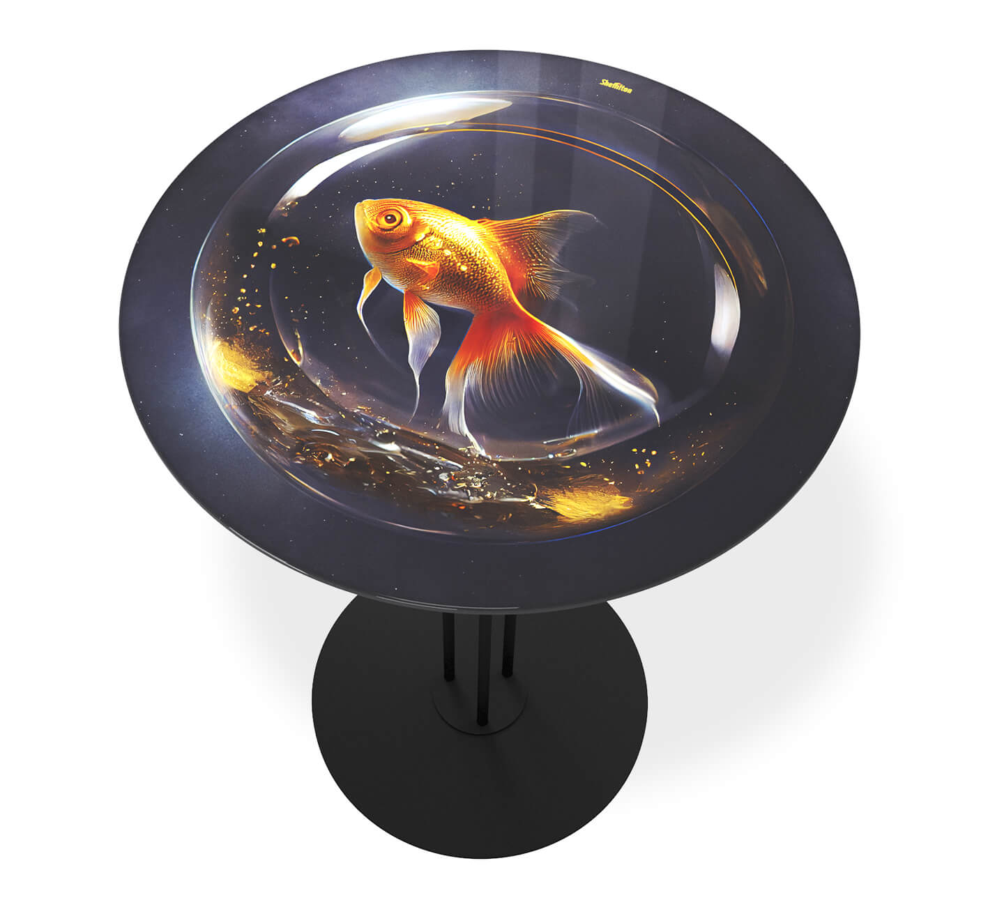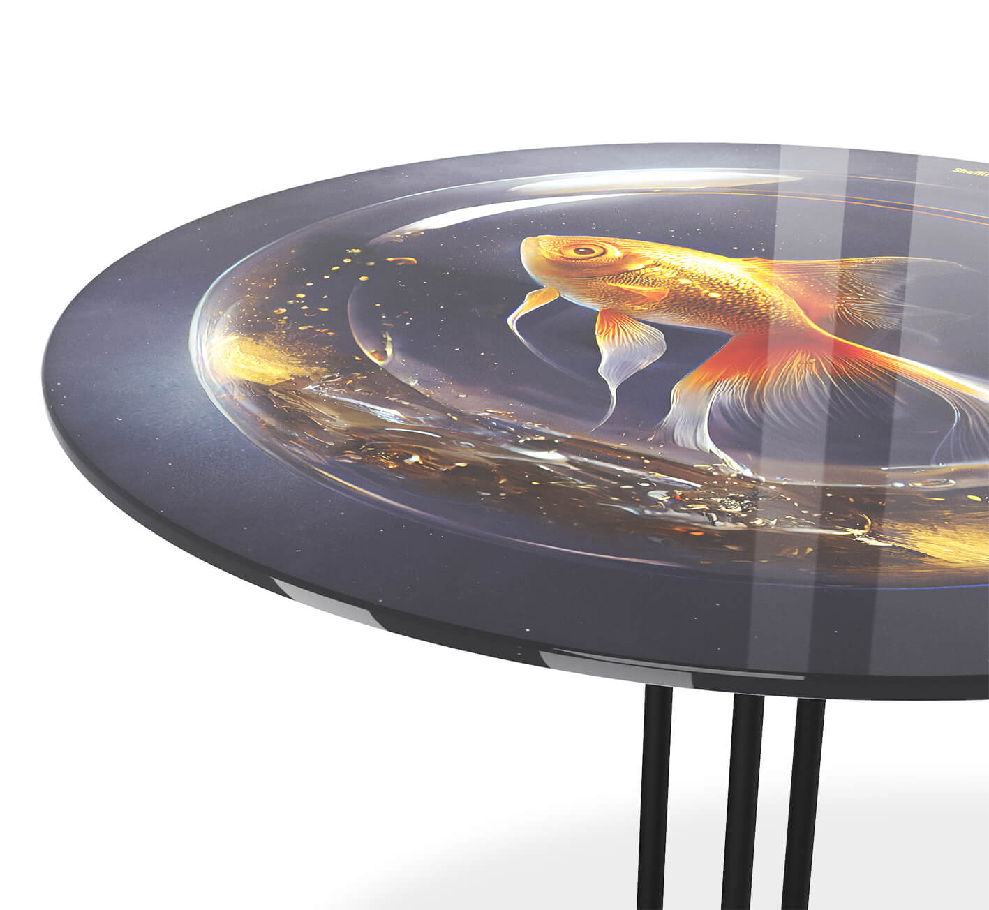 Столешница выполнена из закаленного стекла с ультрафиолетовой печатью. Одним из главных преимуществ закаленного стекла является его стойкость к высоким температурам, вибрационным нагрузкам, ударам и царапинам. Также стекло обладает высокой ударной вязкостью - энергия от столкновения с бьющим предметом распределяется относительно продолжительное время (по сравнению с обычным стеклом), что приводит к разрушению на очень мелкие осколки. Металлический каркас окрашен порошковой краской, устойчивой к механическому воздействию.