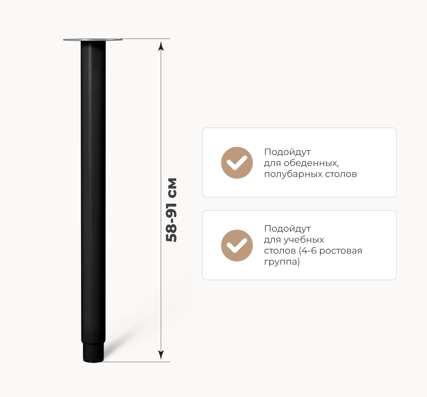 Главное преимущество опор для стола - возможность регулировать опору по высоте (58-91 см). Опоры подойдут для 4-6 ростовой группы, для полубарных столов. Осуществить регулировку опоры легко – поверните нижнюю часть опоры по часовой стрелке и установите нужную высоту, далее закрепите опору поворотом против часовой стрелки. Данные опоры позволят поддерживать правильную позу при работе и минимизировать нагрузку на позвоночник.