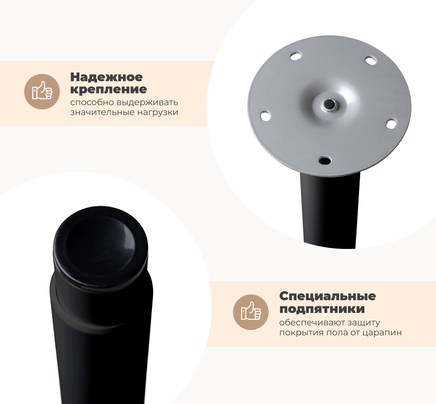 Подстолье выполнено из металла, что обеспечивает прочность и устойчивость. Оно способно выдерживать значительные нагрузки и обеспечивает стабильную основу для стола за счет надежного крепления.