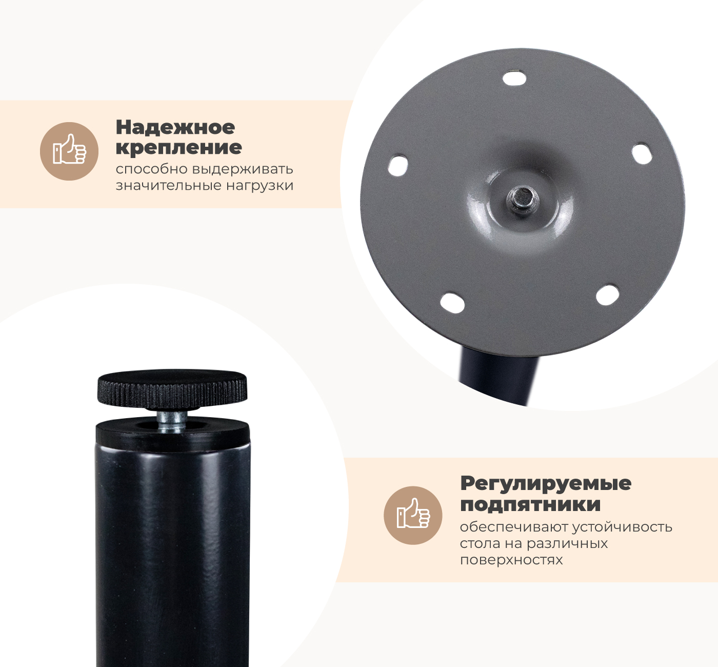 Подстолье выполнено из металла, что обеспечивает прочность и устойчивость. Оно способно выдерживать значительные нагрузки и обеспечивает стабильную основу для стола за счет надежного крепления.