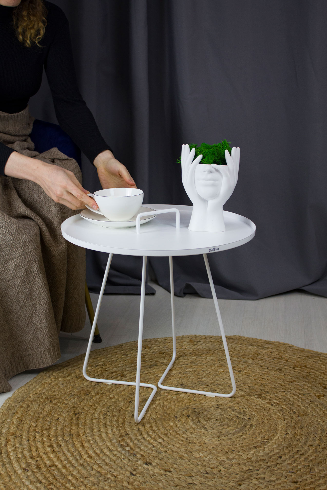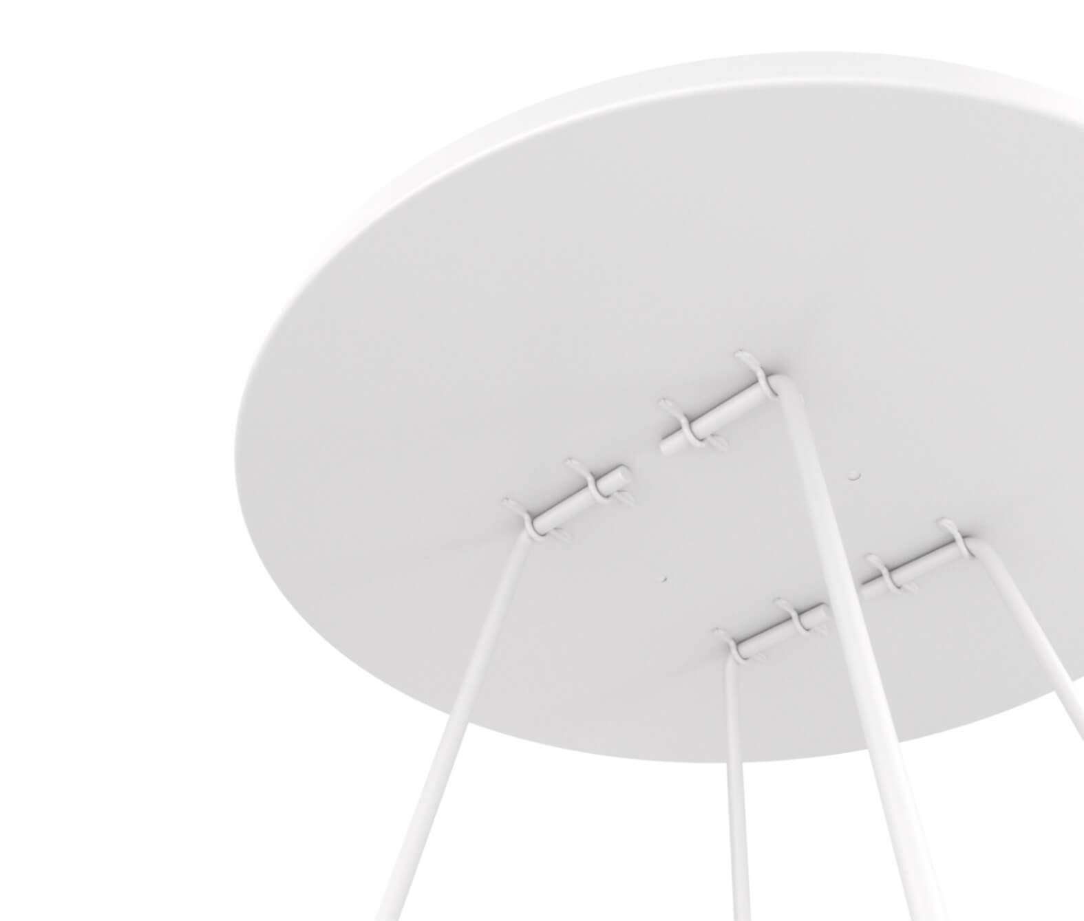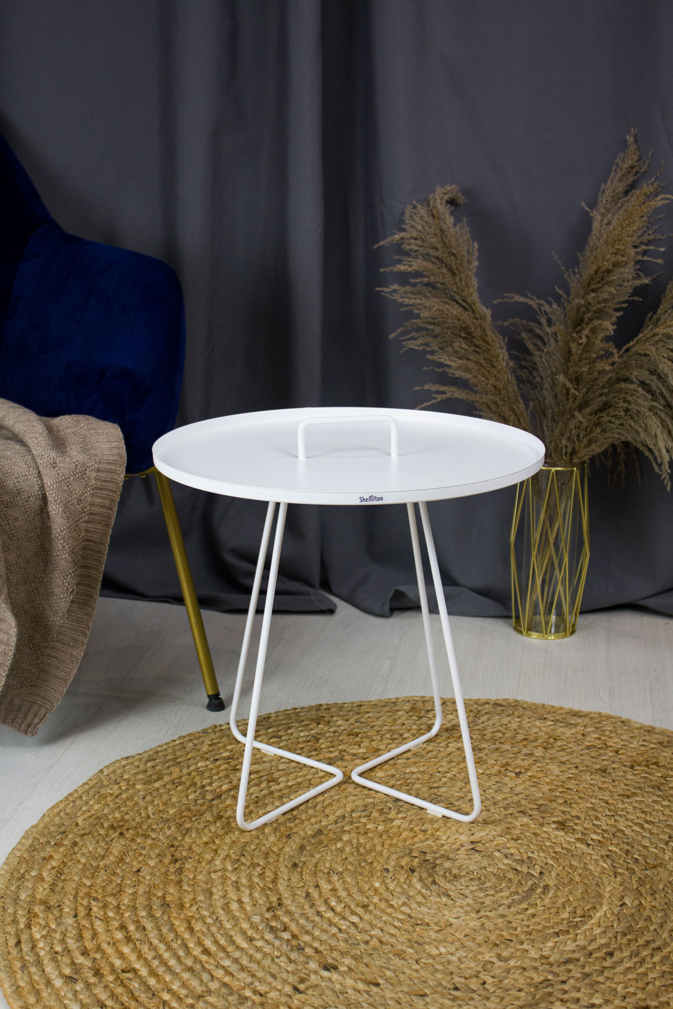 Металлический каркас и столешница окрашены порошковой краской, устойчивой к механическому воздействию. Выполнен из прутка 8 мм и металлического листа толщиной 1 мм. Диаметр столешницы 450 мм.
