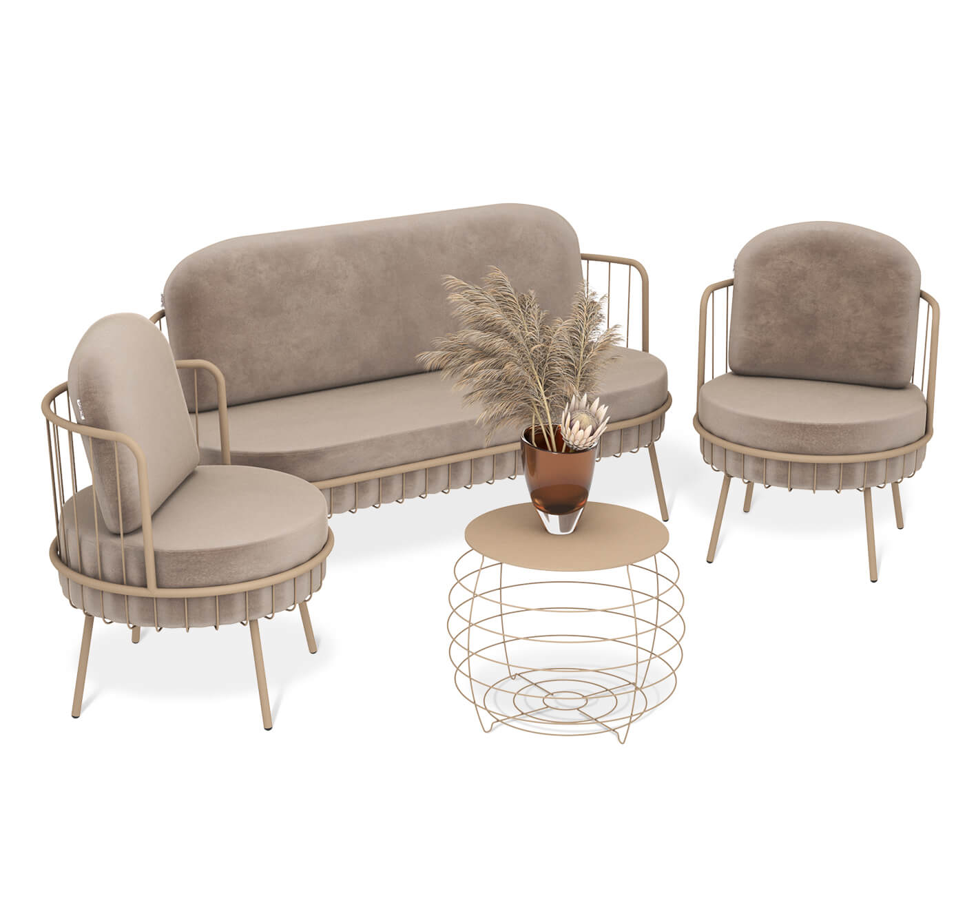 Благодаря своей элегантности и универсальному дизайну, данный комплект станет неотъемлемой частью вашего интерьера и привлечет восхищенные взгляды гостей. Линии металлического каркаса придают дивану и креслам легкий и парящий вид. Эргономичная удобная форма, мягкие подушки создают еще больший комфорт при использовании.