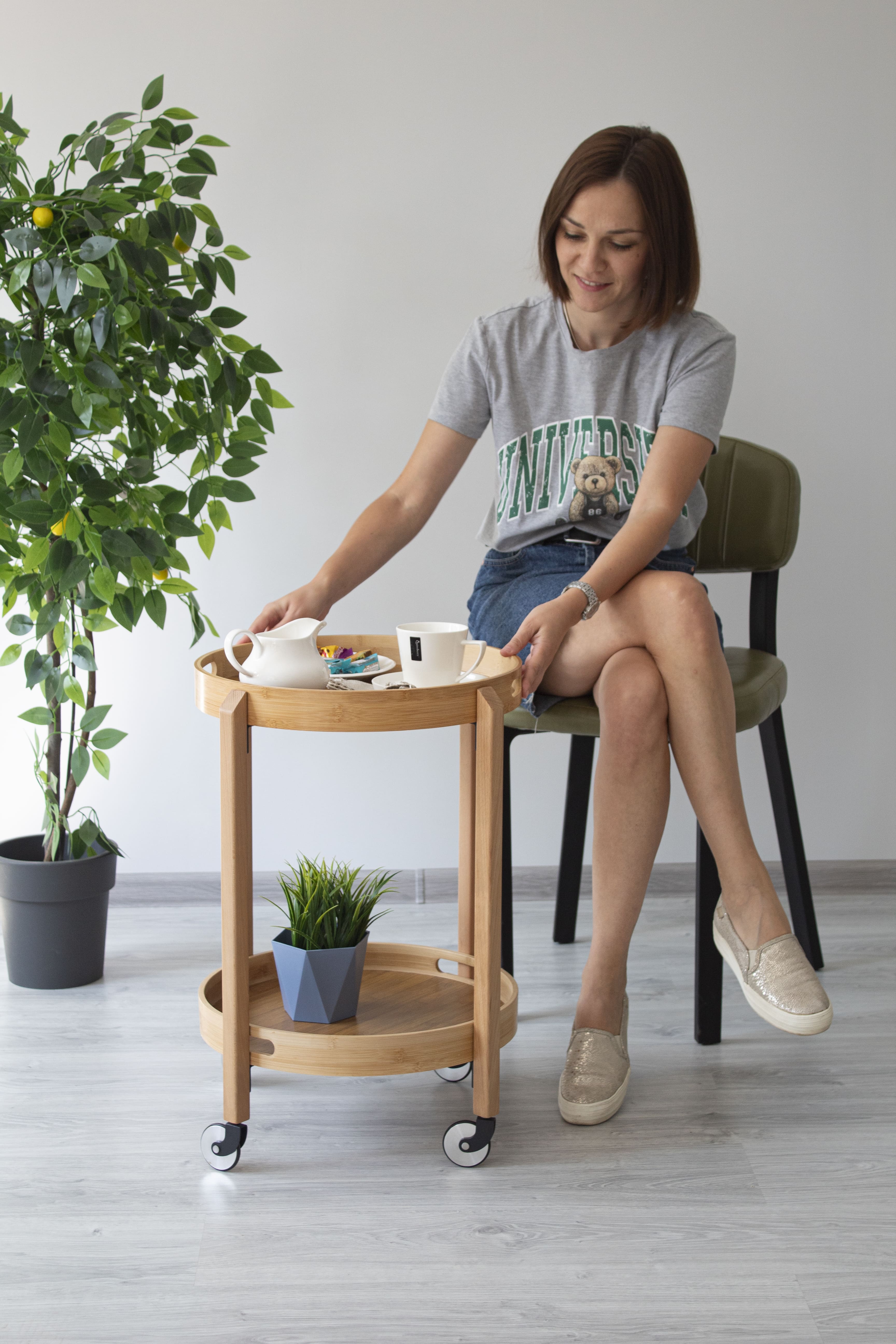 Двухъярусный бамбуковый сервировочный столик на колесах— это практичное дизайнерское решение для интерьера гостиной, спальни, кухни или кабинета. Благодаря своей компактности и функциональности, приставной столик станет незаменимым помощником в организации пространства.