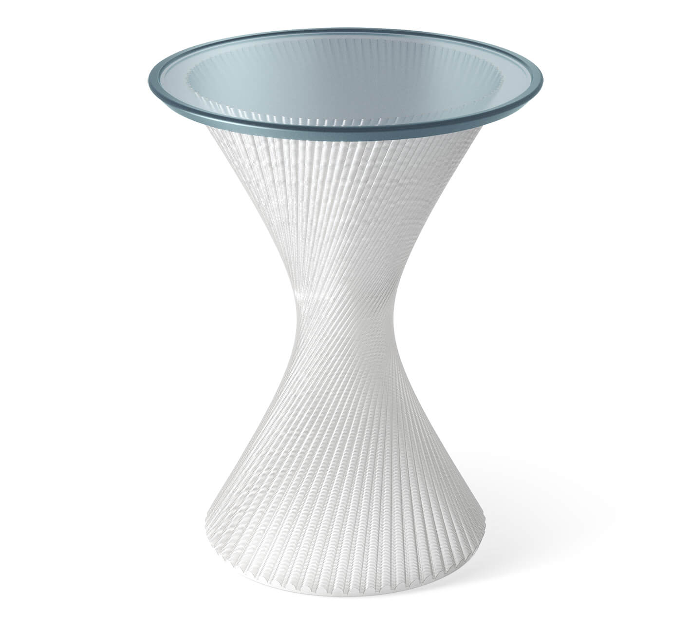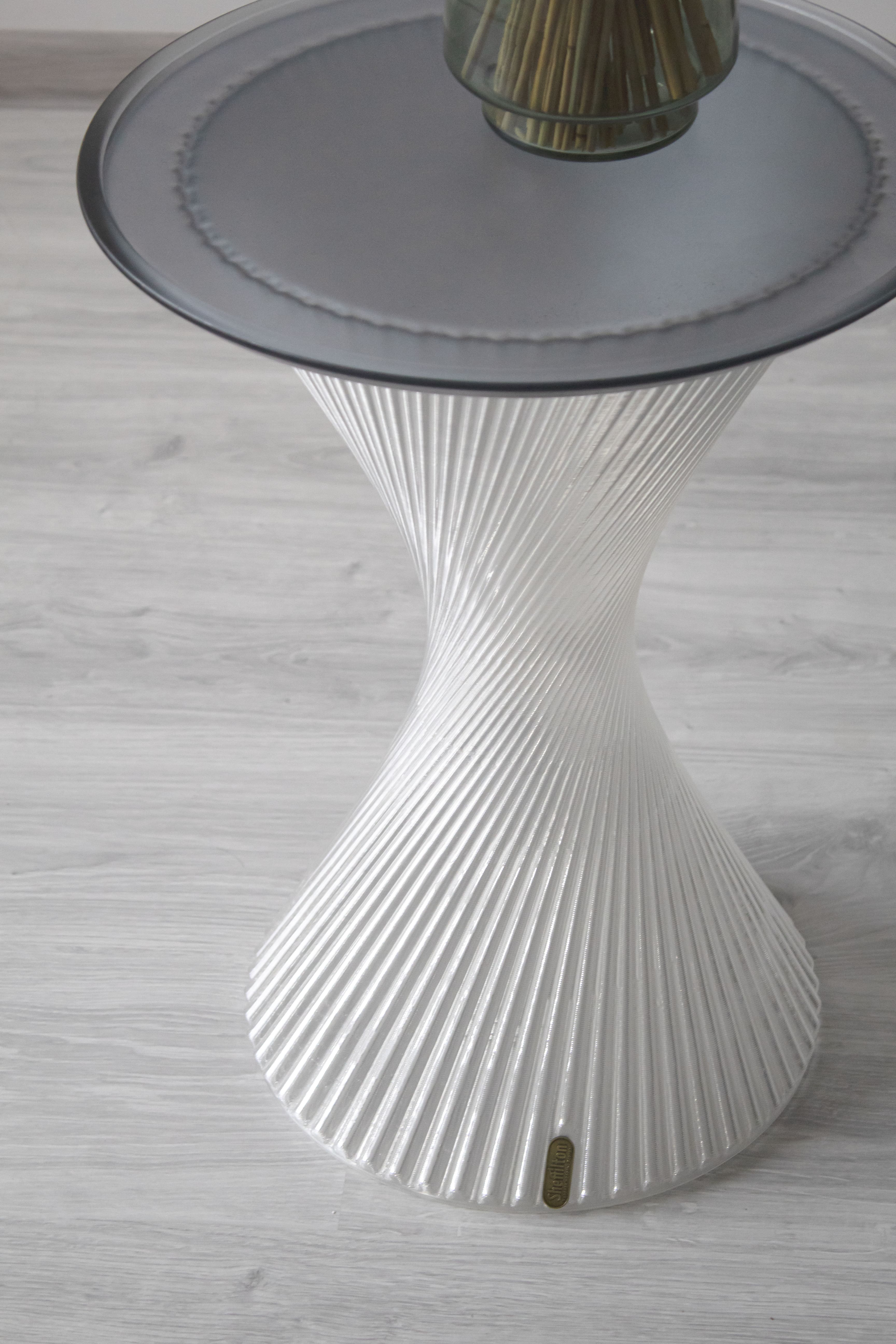 Благодаря использованию стекловидного материала, лучи проходящего света создают необыкновенную игру бликов, и делают столик визуально лёгким, не перегружая пространство.