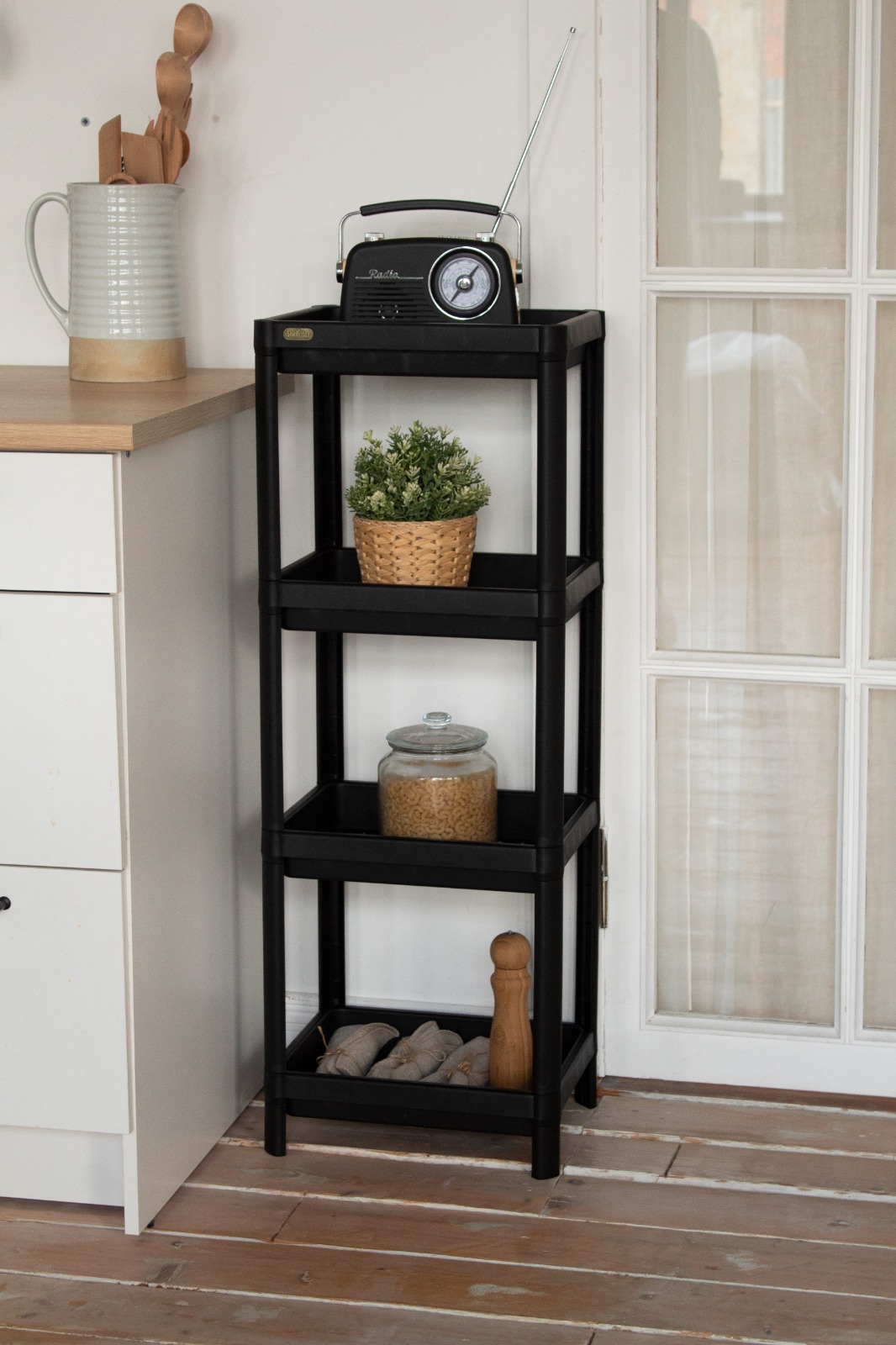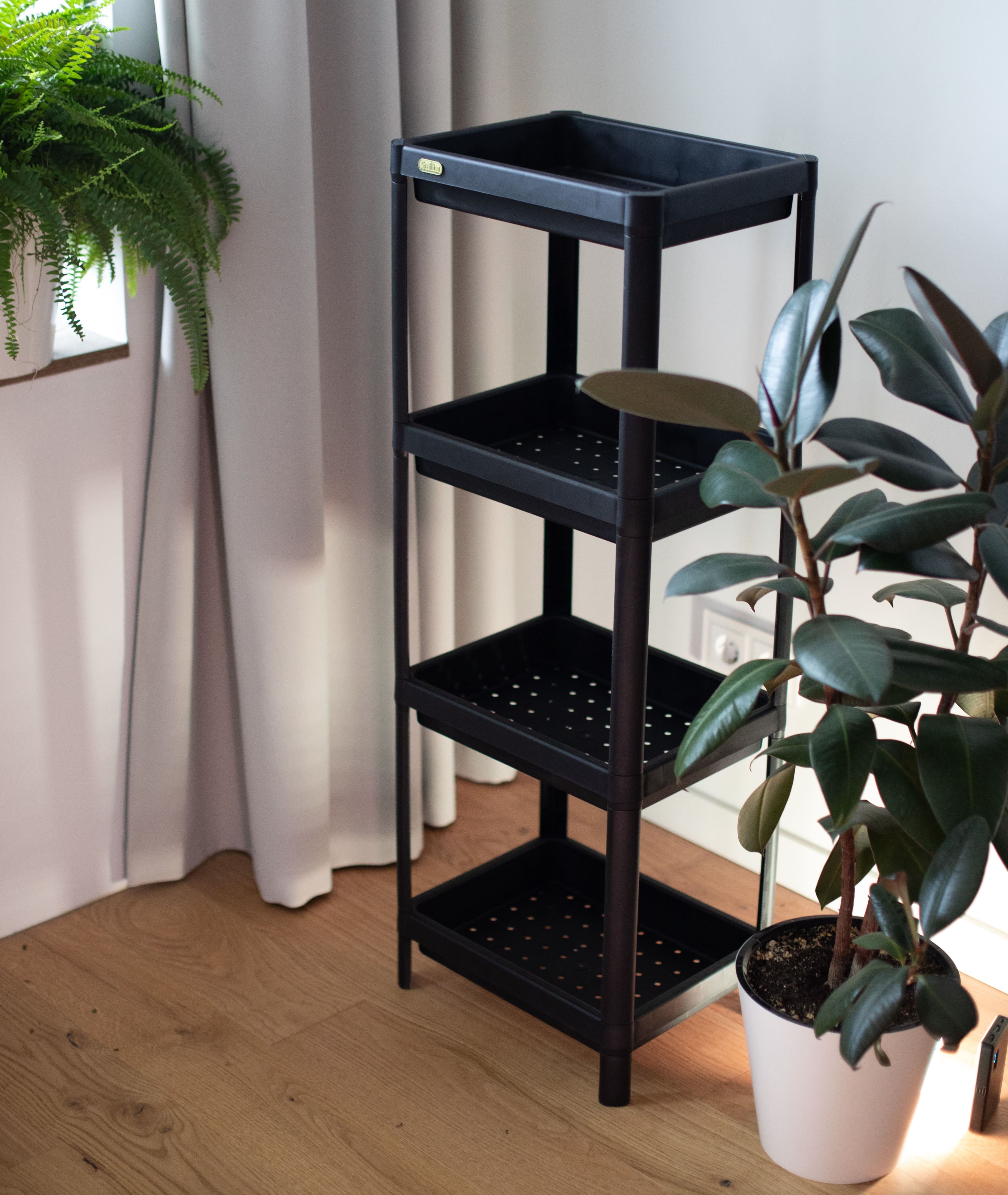 Стеллаж выполнен из полипропилена с армирующими добавками толщина пластика составляет 2,5 мм, что обеспечивает высокую жесткость и надежность конструкции. Благодаря этому, каждая полка выдерживает 6 кг.  Изделие устойчиво к ударам, воздействиям окружающей среды,  не боится воды, влаги и солнечных лучей, поэтому этажерку можно использовать в любых условиях.