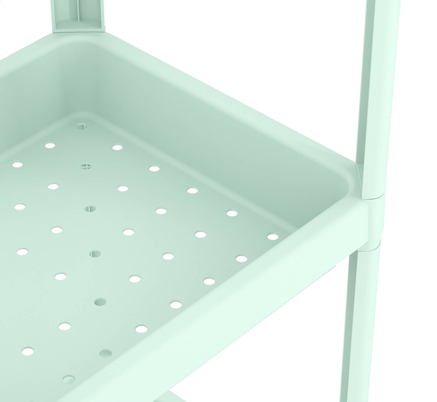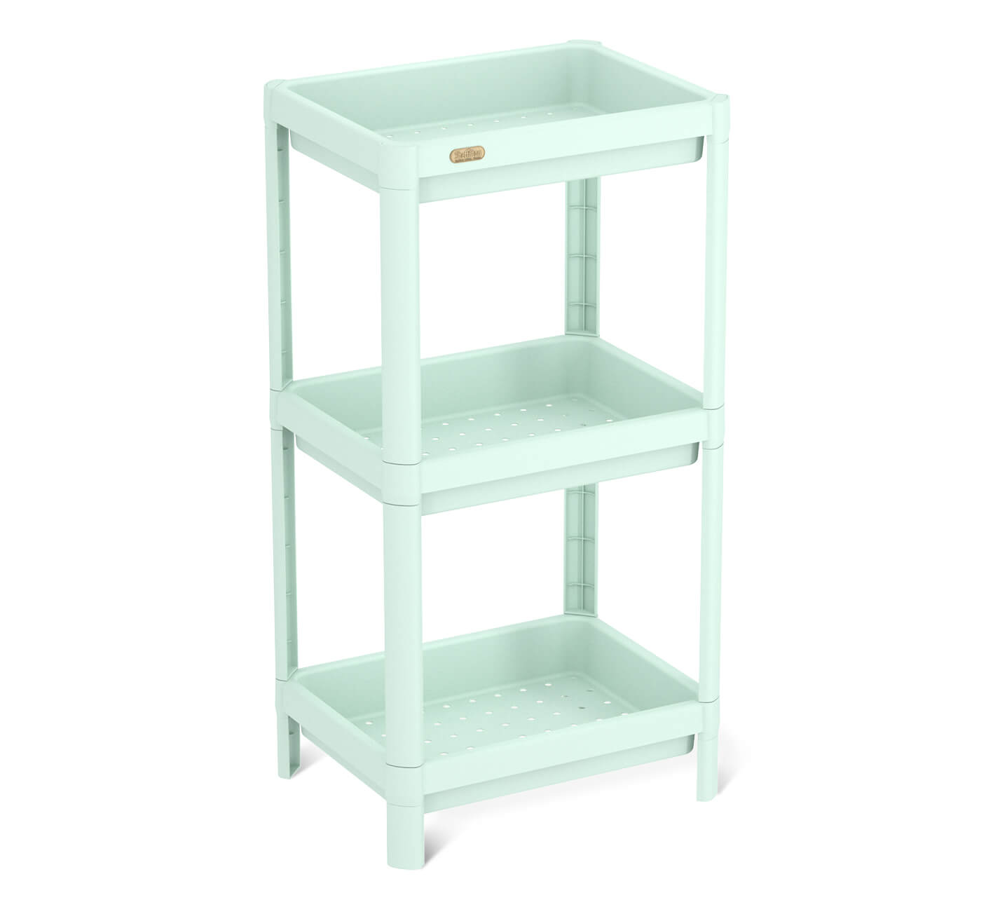 Этот стеллаж оснащён тремя полками с бортиками высотой 6 см , которые надежно защищают ваши вещи от падения. На дне каждой полки имеются отверстия, благодаря которым влага и вода не будут накапливаться.