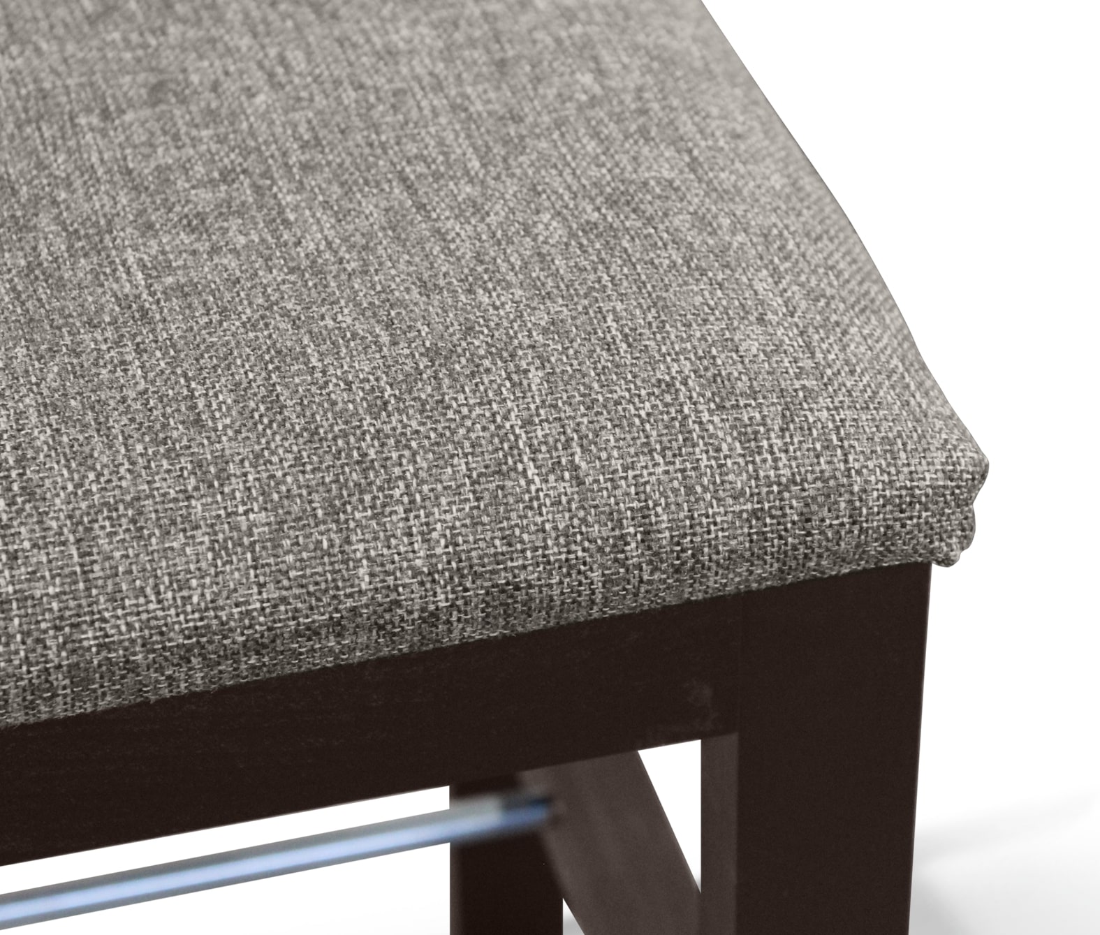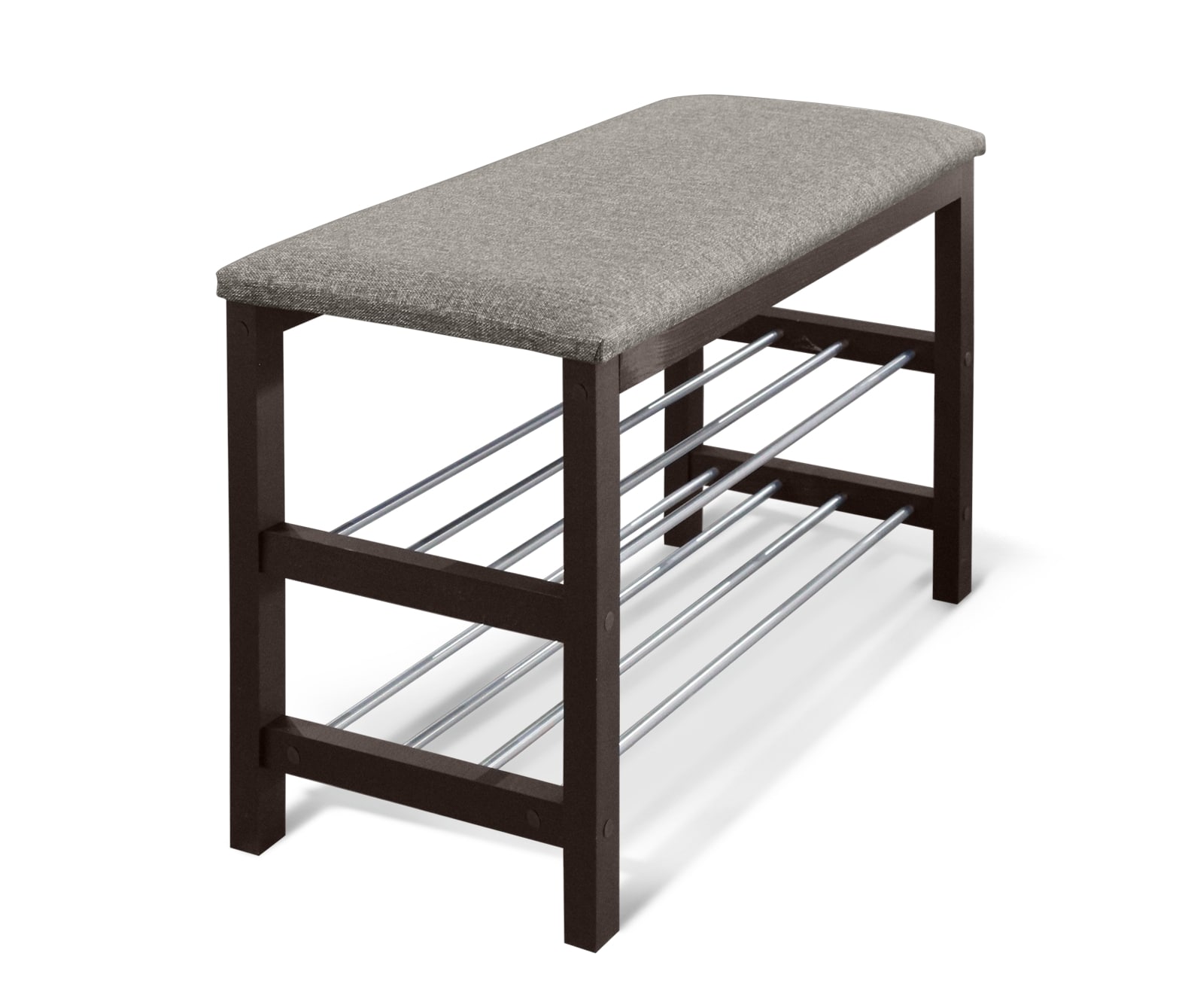 Каркас выполнен из массива древесины с последующим тонированием и покрытием лаком. Полка для обуви выполнена из металлической трубы. Сидение выполнено из рогожки с мягким наполнителем.