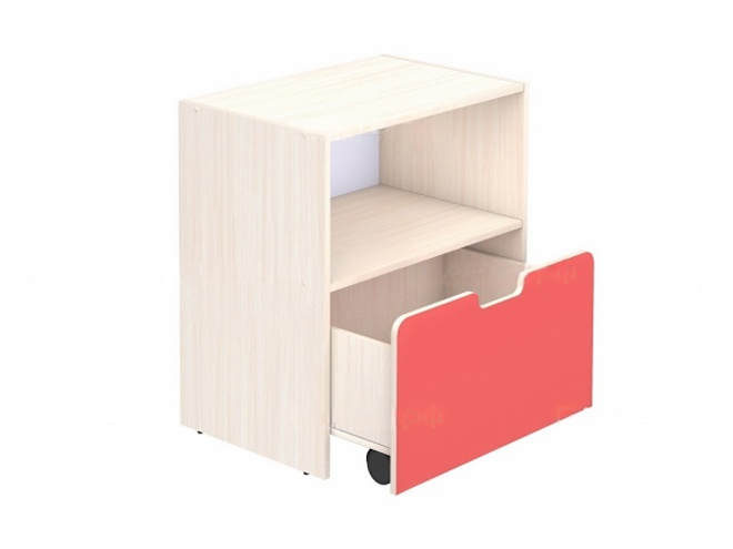 Корпус стеллажа и фасад ящика - из ЛДСП 16 мм, цвет на выбор. Кромки – ПВХ. Задняя стенка и дно ящика – HDF 3 мм. Опоры мебельные регулируемые, предотвращающие повреждение покрытия пола. Ящики на опорах колесных D 50 мм. Предусмотрено крепление к стене.