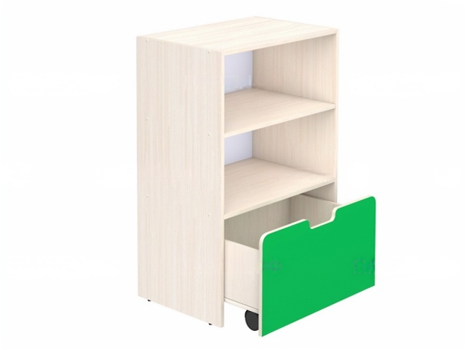 Корпус стеллажа и фасад ящика - из ЛДСП 16 мм, цвет на выбор. Кромки – ПВХ. Задняя стенка и дно ящика – HDF 3 мм. Опоры мебельные регулируемые, предотвращающие повреждение покрытия пола. Ящики на опорах колесных D 50 мм. Предусмотрено крепление к стене.