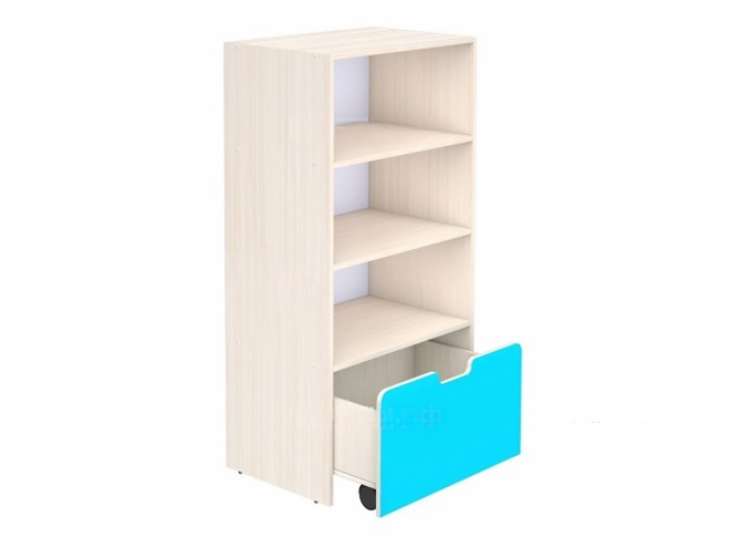 Корпус стеллажа и фасад ящика - из ЛДСП 16 мм, цвет на выбор. Кромки – ПВХ. Задняя стенка и дно ящика – HDF 3 мм. Опоры мебельные регулируемые, предотвращающие повреждение покрытия пола. Ящики на опорах колесных D 50 мм. Предусмотрено крепление к стене.