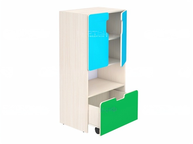 Корпус стеллажа и фасад ящика - из ЛДСП 16 мм, цвет на выбор. Кромки – ПВХ. Задняя стенка и дно ящика – HDF 3 мм. Опоры мебельные регулируемые, предотвращающие повреждение покрытия пола. Ящики на опорах колесных D 50 мм. Предусмотрено крепление к стене.