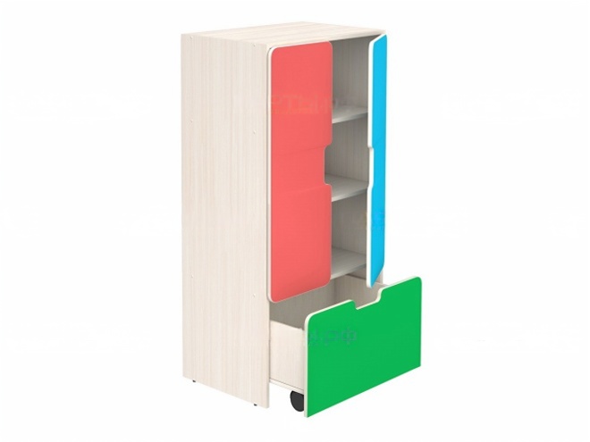 Корпус стеллажа и фасад ящика - из ЛДСП 16 мм, цвет на выбор. Кромки – ПВХ. Задняя стенка и дно ящика – HDF 3 мм. Опоры мебельные регулируемые, предотвращающие повреждение покрытия пола. Ящики на опорах колесных D 50 мм. Предусмотрено крепление к стене.