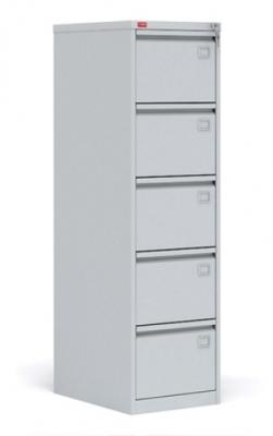 Металлическая сборно-разборная картотека, пятисекционная, с центральным замком, который закрывает все ящики. Используется для хранения документации в форматах Foolscap и А4. Имеет антиопрокидывающее устройство и телескопические направляющие. Полимерное порошковое покрытие светло-серого цвета (RAL 7035).
