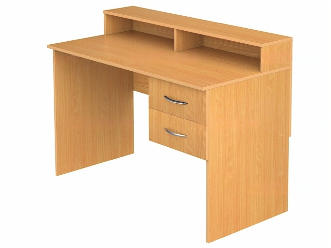 Корпус школьного стола-кафедры библиотечного для выдачи книг изготовлен из ЛДСП 16 мм, цвет "Бук Бавария". Кромки – ПВХ толщиной 2 мм (столешница и полка) или 0,4 мм (остальные детали). Направляющие выкатных ящиков тумбы на 450 мм – роликовые. Стойки стола имеют регулируемые ножки с врезной муфтой М6х20 мм, предотвращающие повреждение покрытия пола.