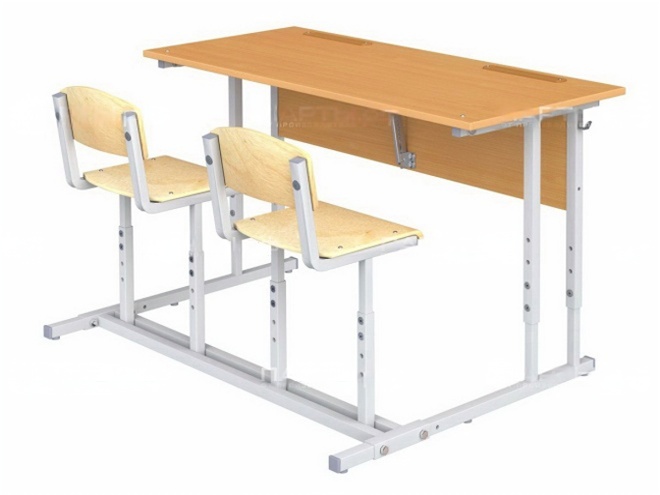 Столешница и царга парты из ЛДСП 16 мм, цвет "Бук Бавария". Кромки – ПВХ толщиной 2 мм (столешница и полка) или 0,4 мм (царга, сидение и спинка). Сиденье и спинка с закругленными углами, производятся из гнутоклеёной берёзовой фанеры, имеют многослойное лаковое защитно-декоративное покрытие. Крепление к металлокаркасу с помощью скрытых металлических футорок – без выступающих на рабочей поверхности болтов. В столешнице установлены лотки для письменных принадлежностей.