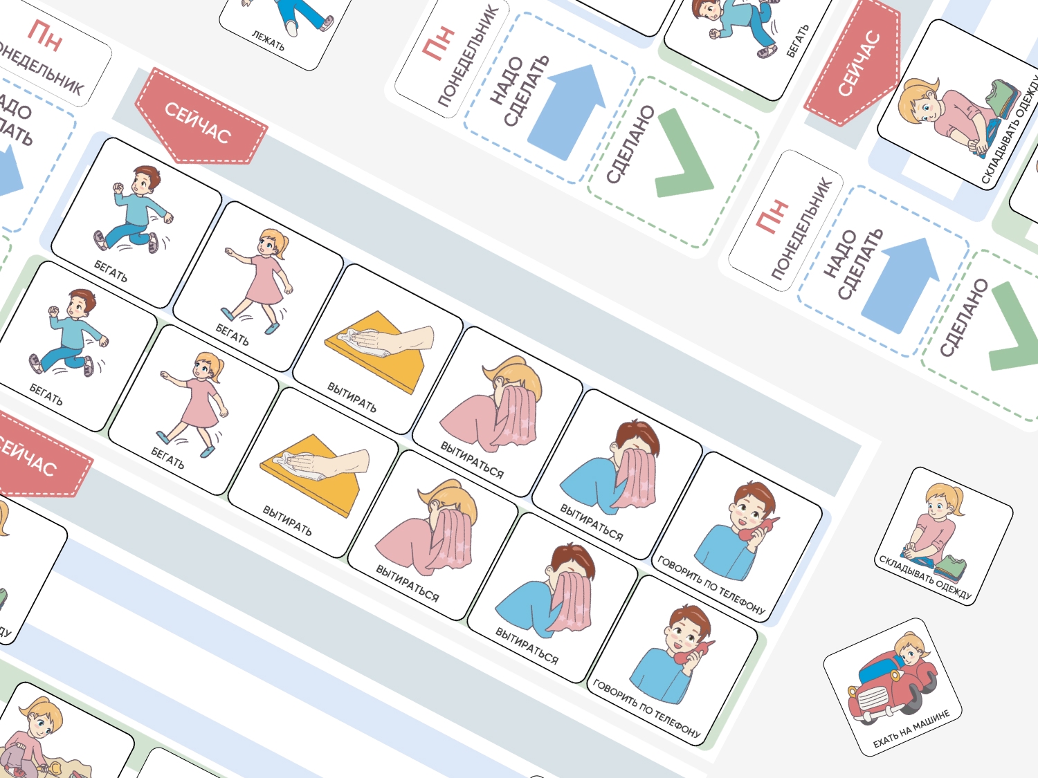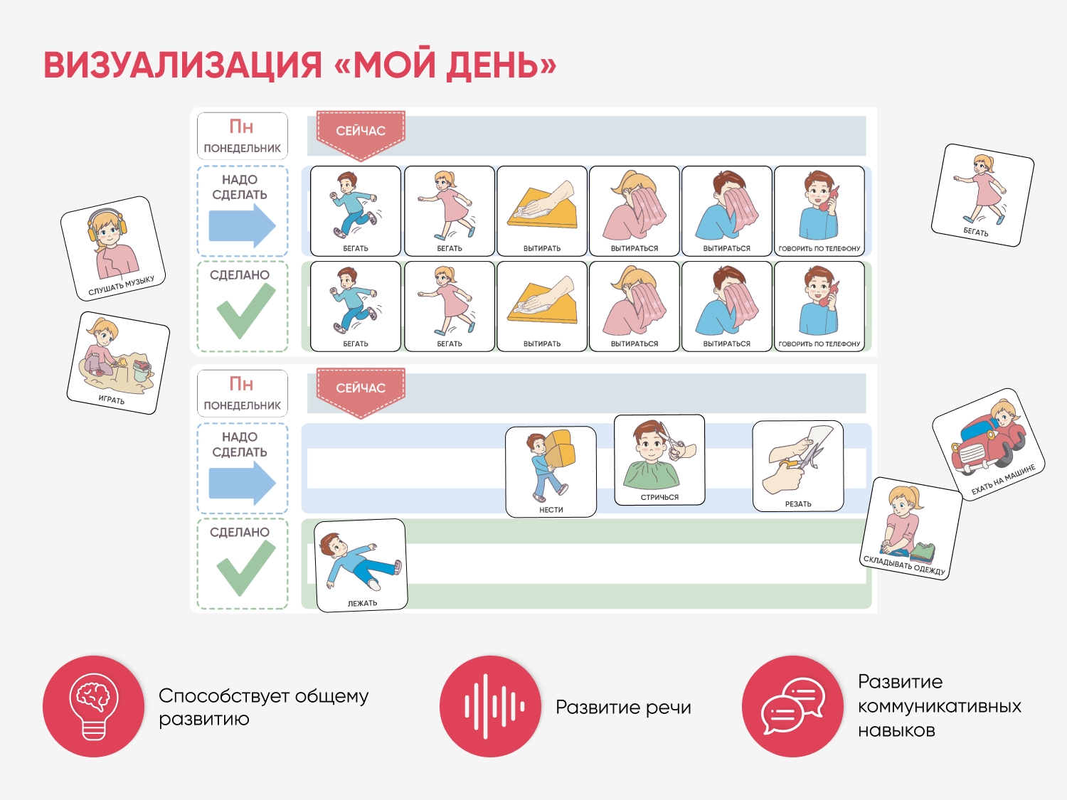 Визуализация для демонстрации последовательности событий в течении дня. Помогает снять напряжение, поддерживает мотивацию ребенка.