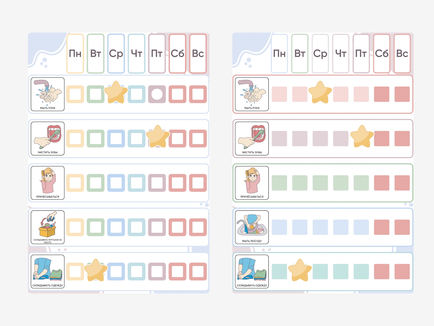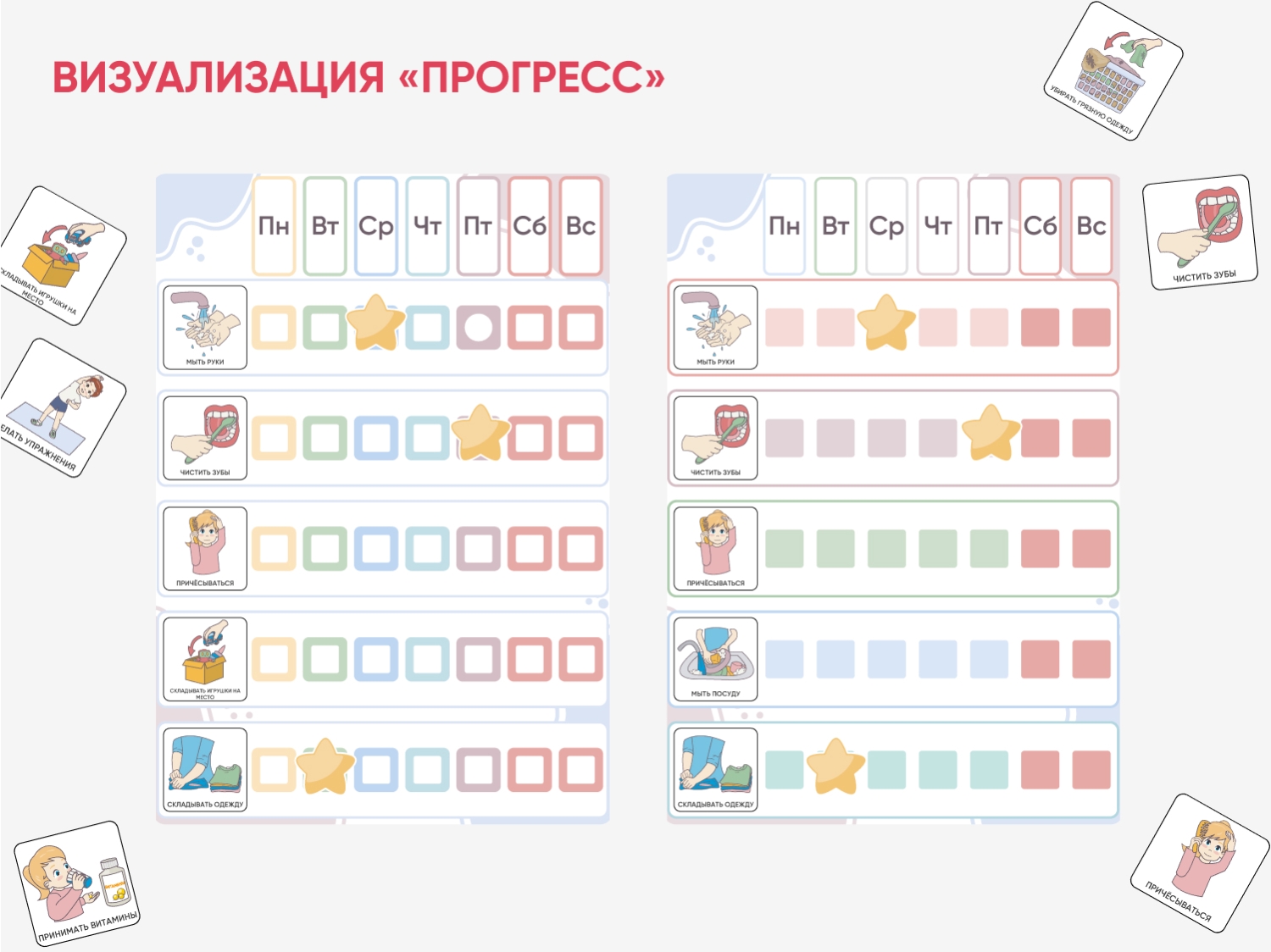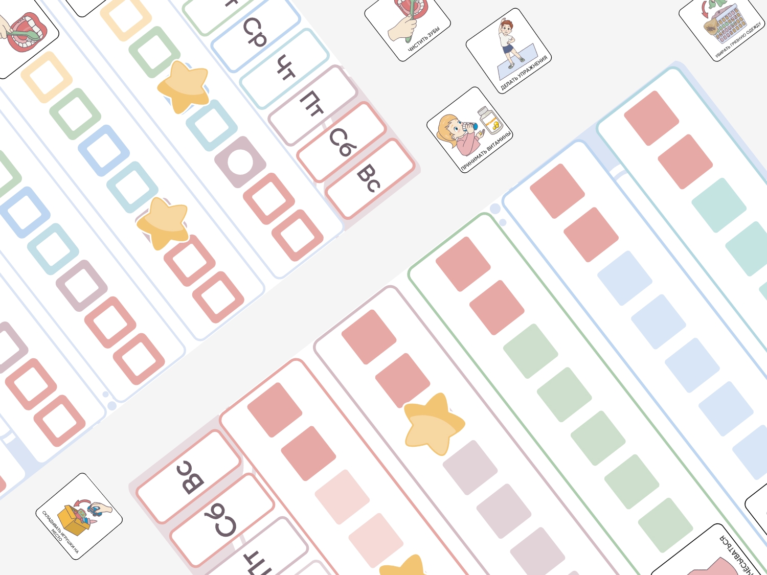 Пособие для организации обучения ребенка ежедневным рутинам: чистить зубы, собирать игрушки, собирать портфель и другие. Помогает фиксировать успешность формирования новой привычки и поддерживает мотивацию ребенка. Карточки для мальчика и для девочки.