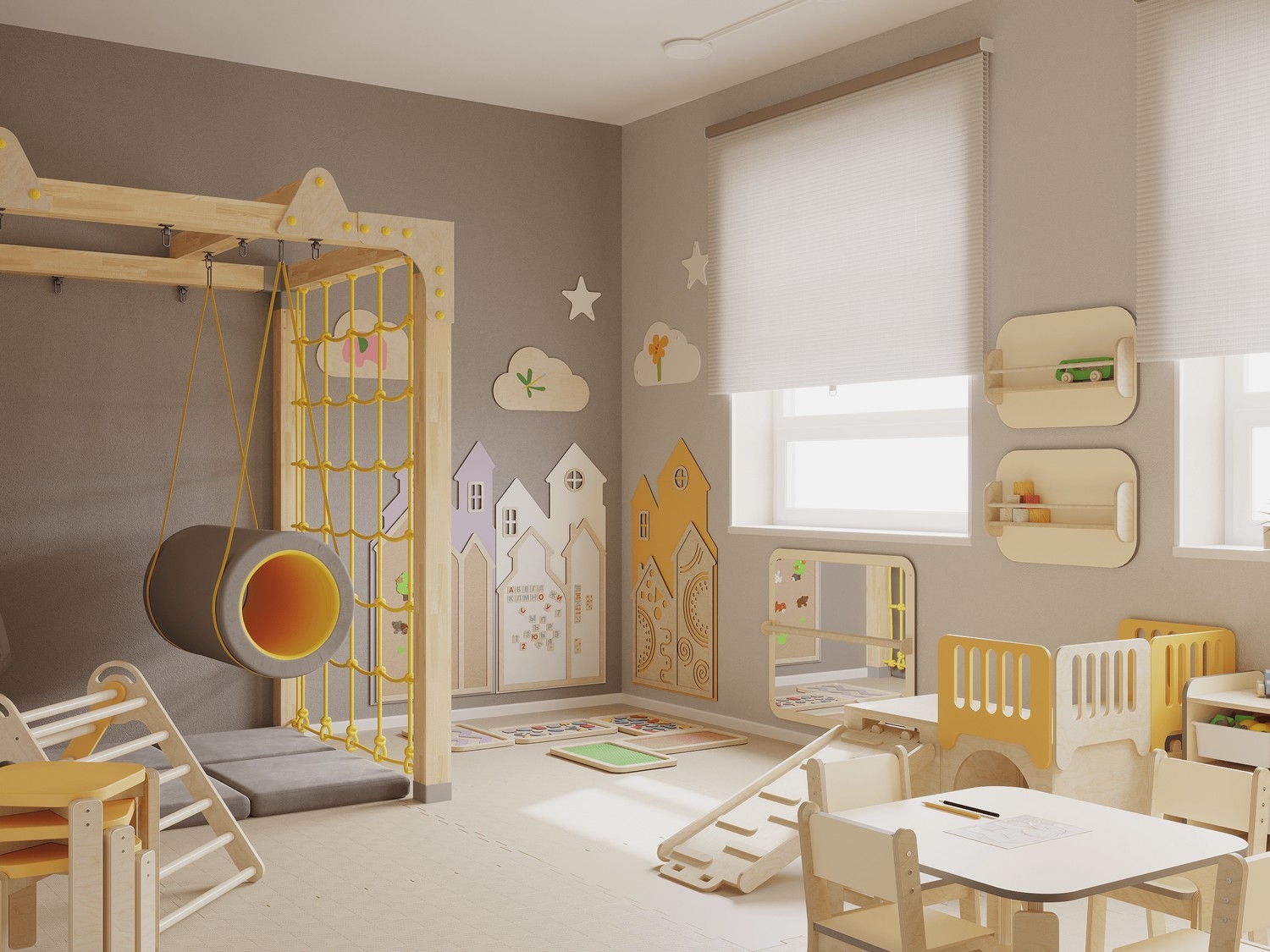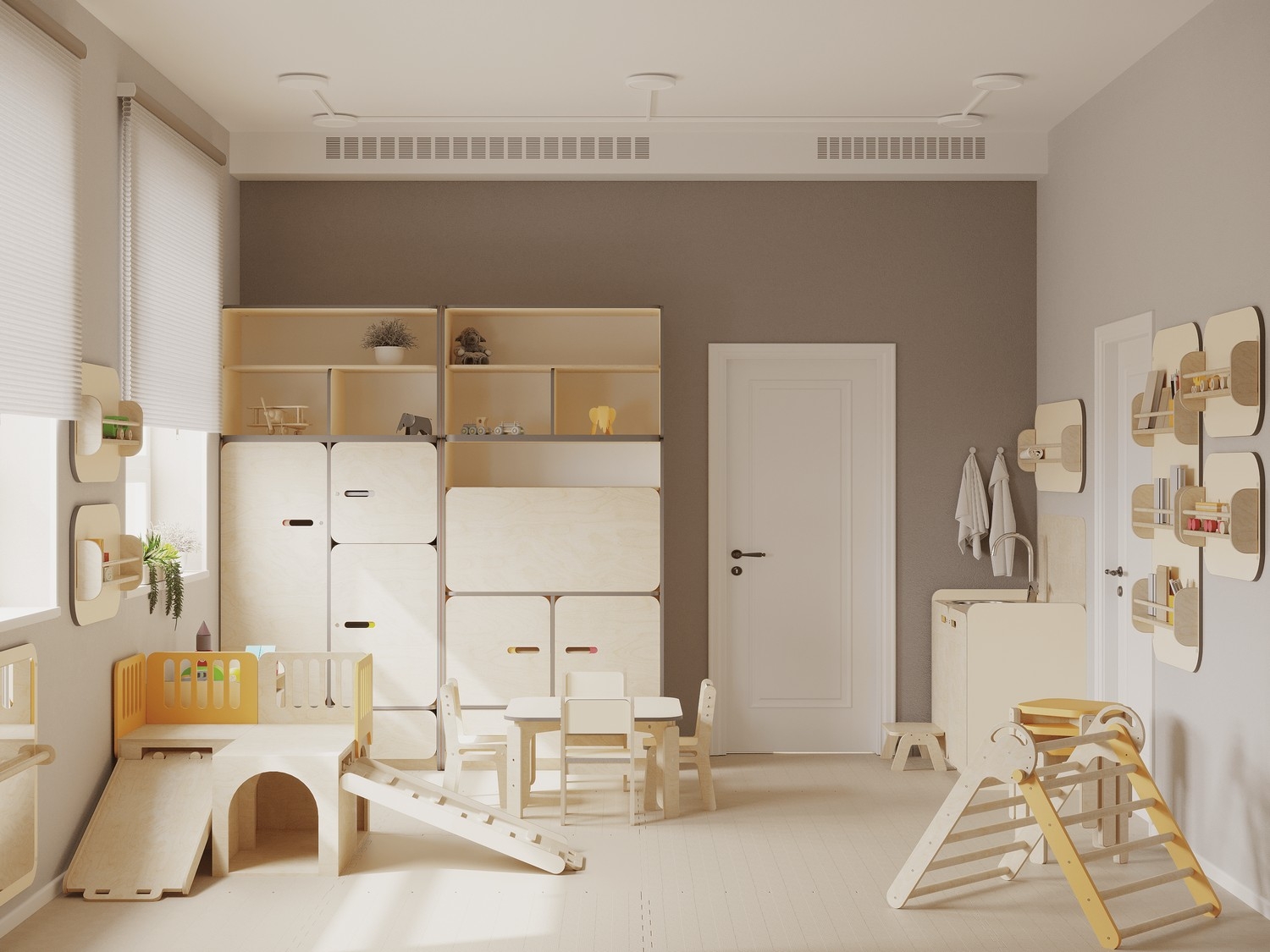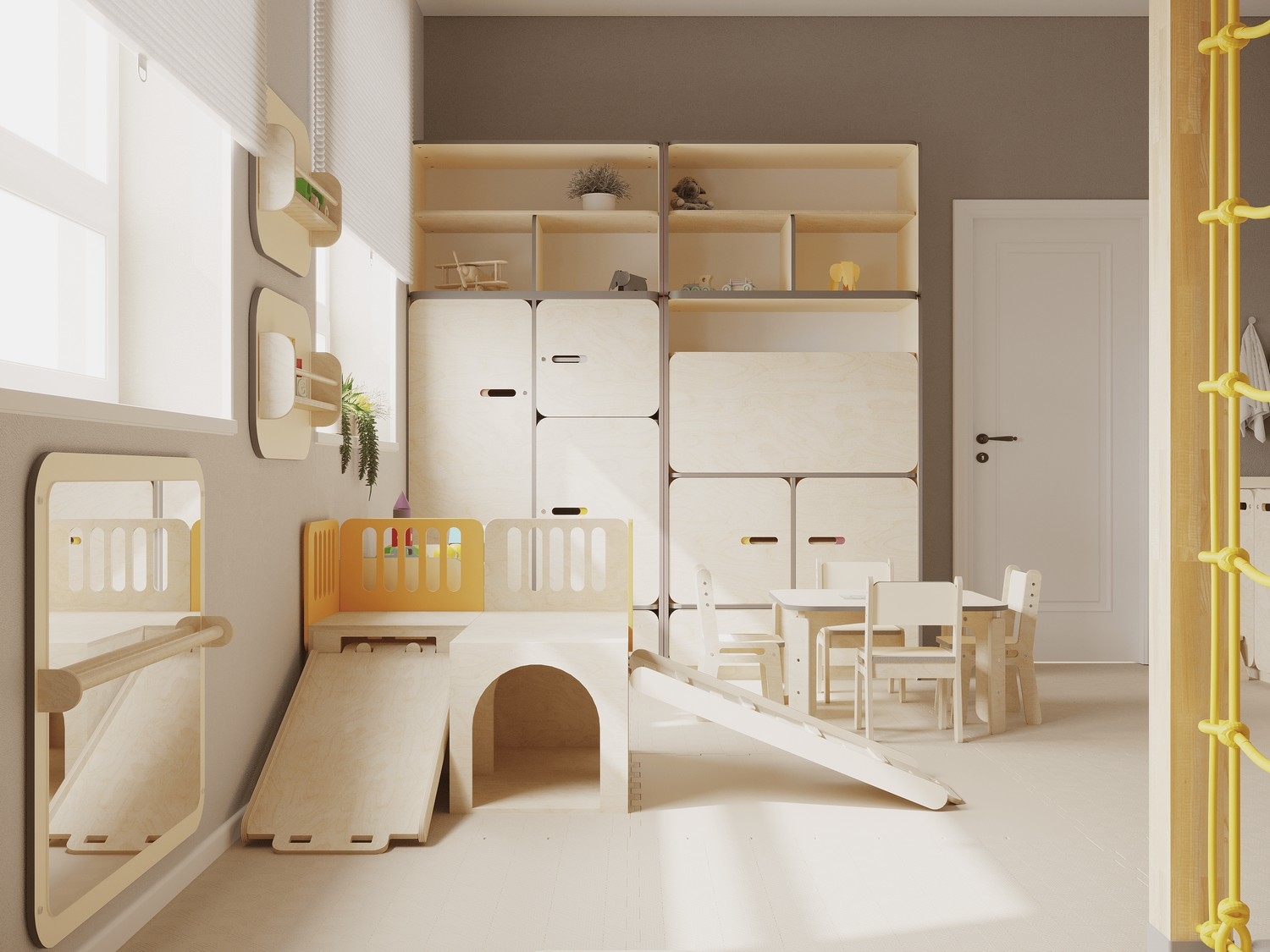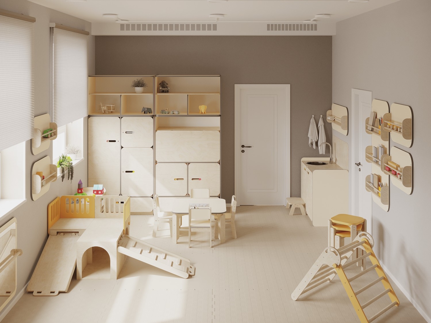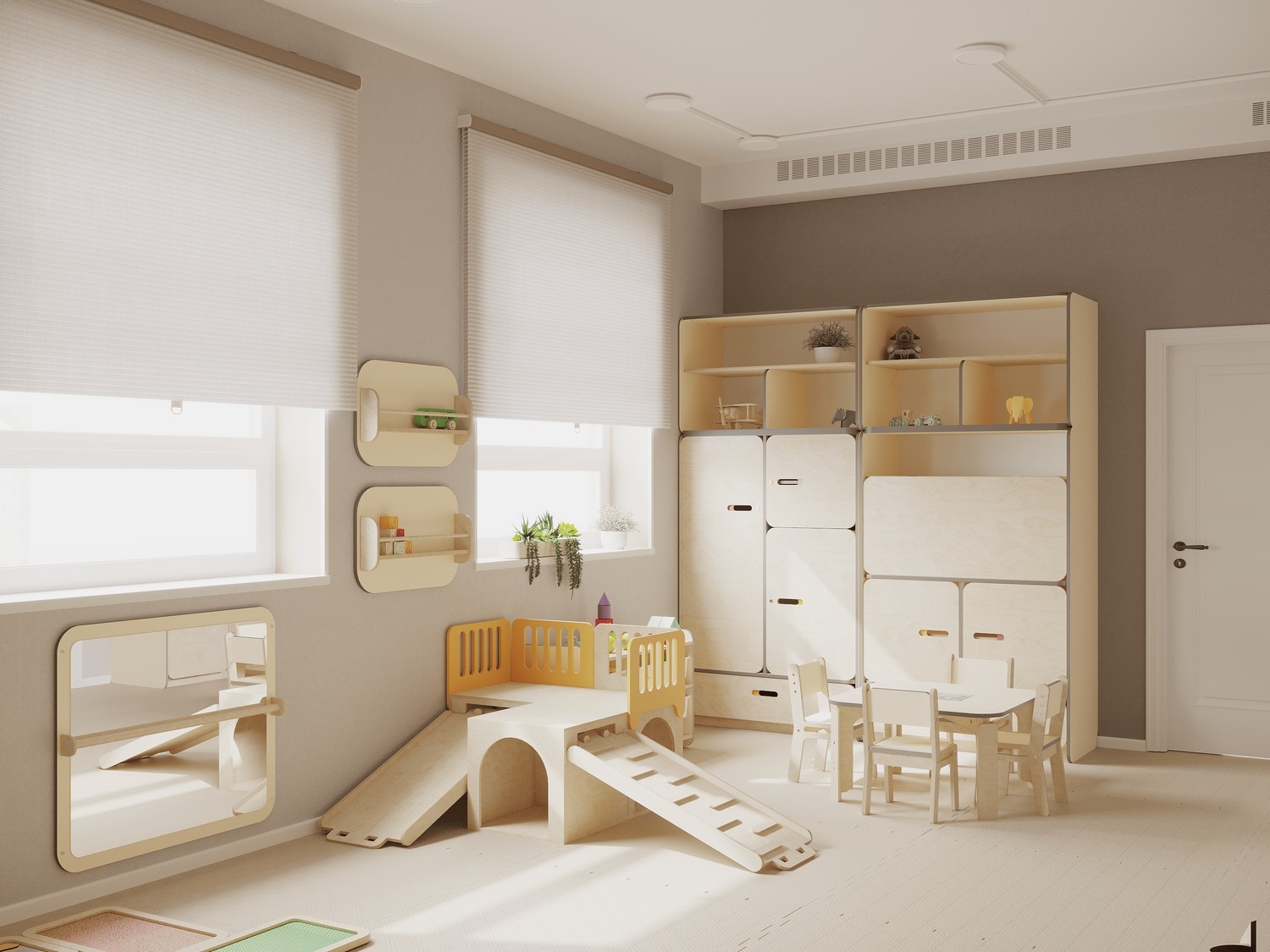 Оборудование подходит для различных обучающих и развивающих игр. Каждое оборудование безопасно для использования детьми: имеет скругленные углы, дополнено мягкими матами, а дверцы шкафов закрываются на ключ. Важным и обязательным наполнением пространства является модуль с раковиной для проведения гигиенических процедур.