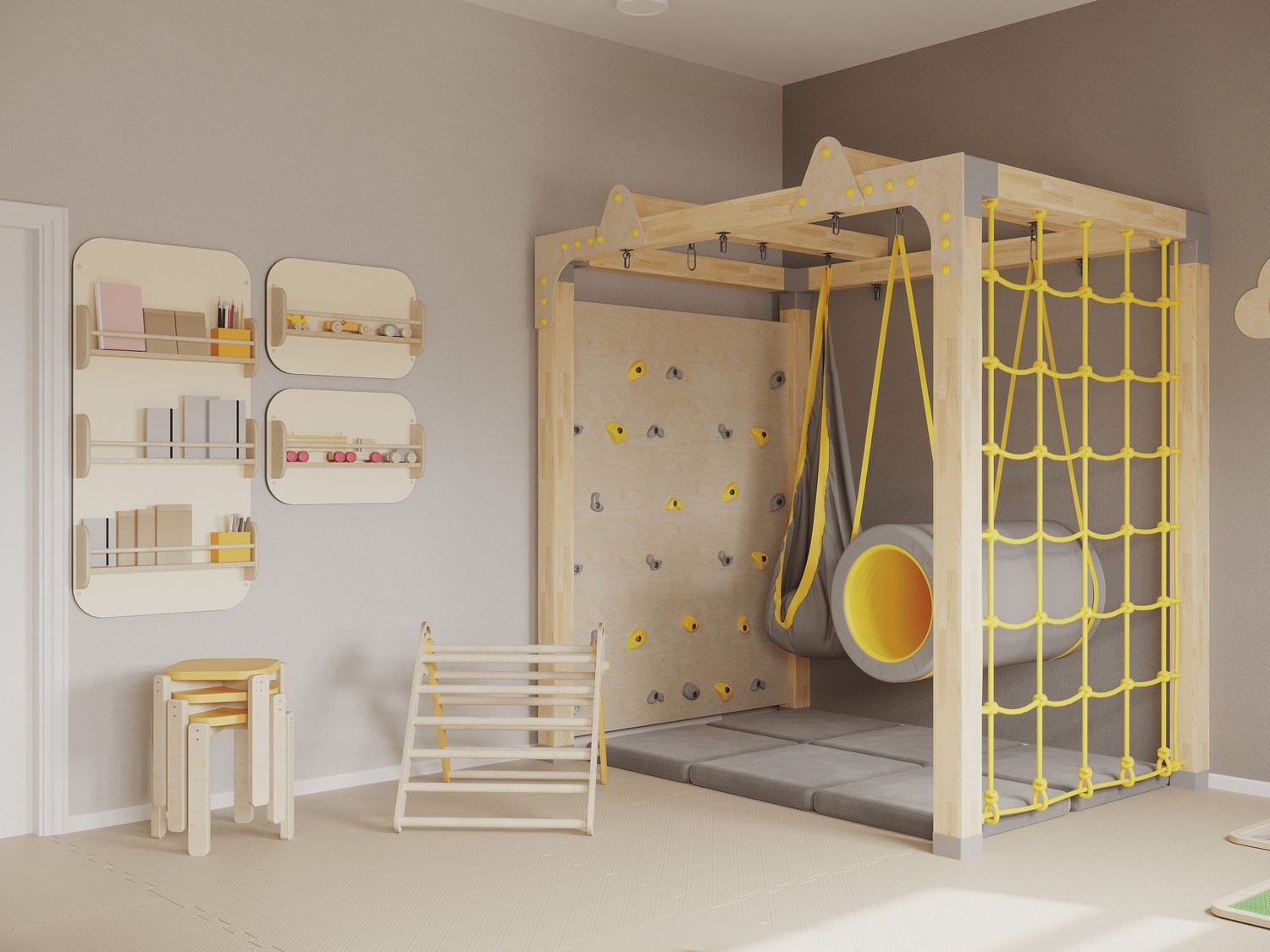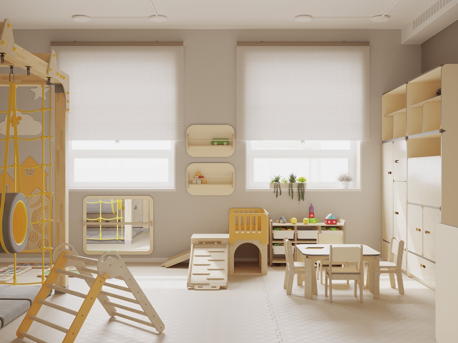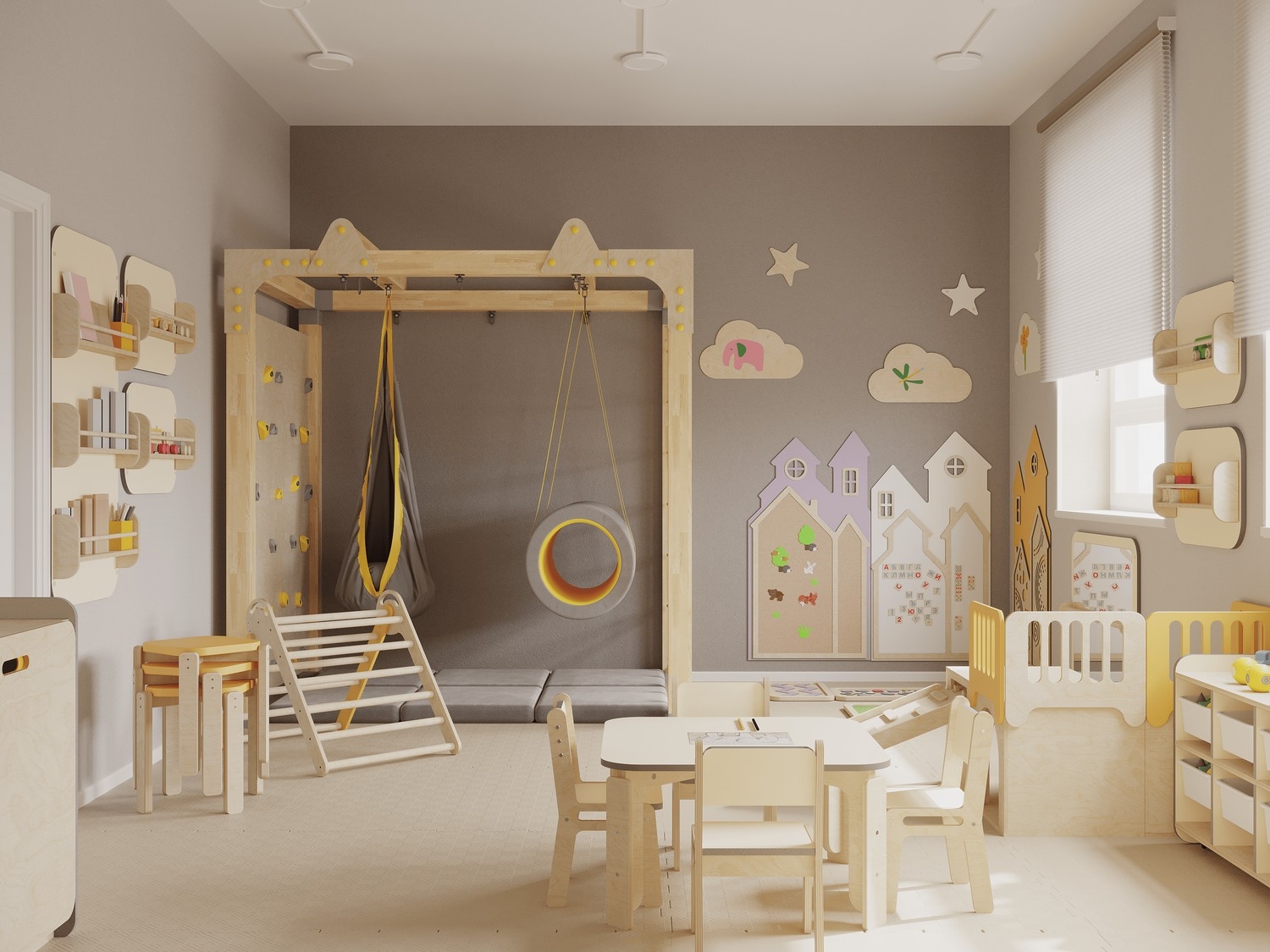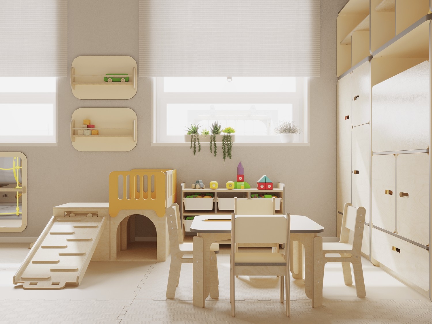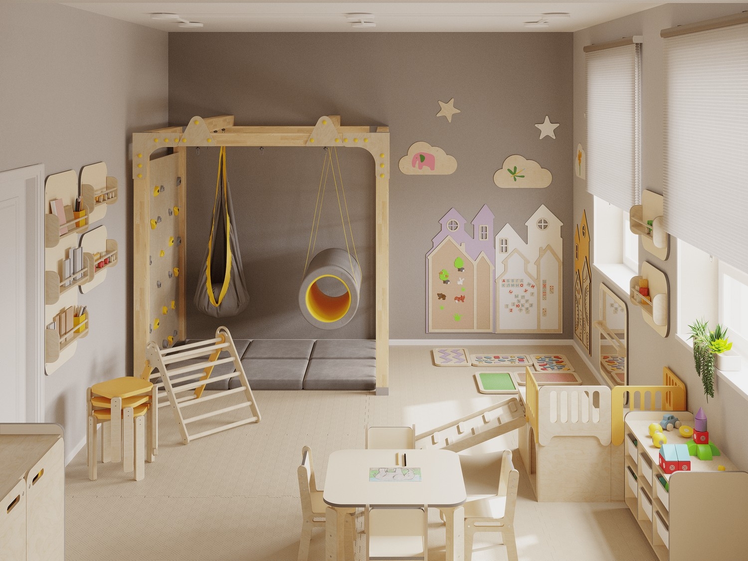 Оборудование подходит для различных обучающих и развивающих игр. Каждое оборудование безопасно для использования детьми: имеет скругленные углы, дополнено мягкими матами, а дверцы шкафов закрываются на ключ. Важным и обязательным наполнением пространства является модуль с раковиной для проведения гигиенических процедур.