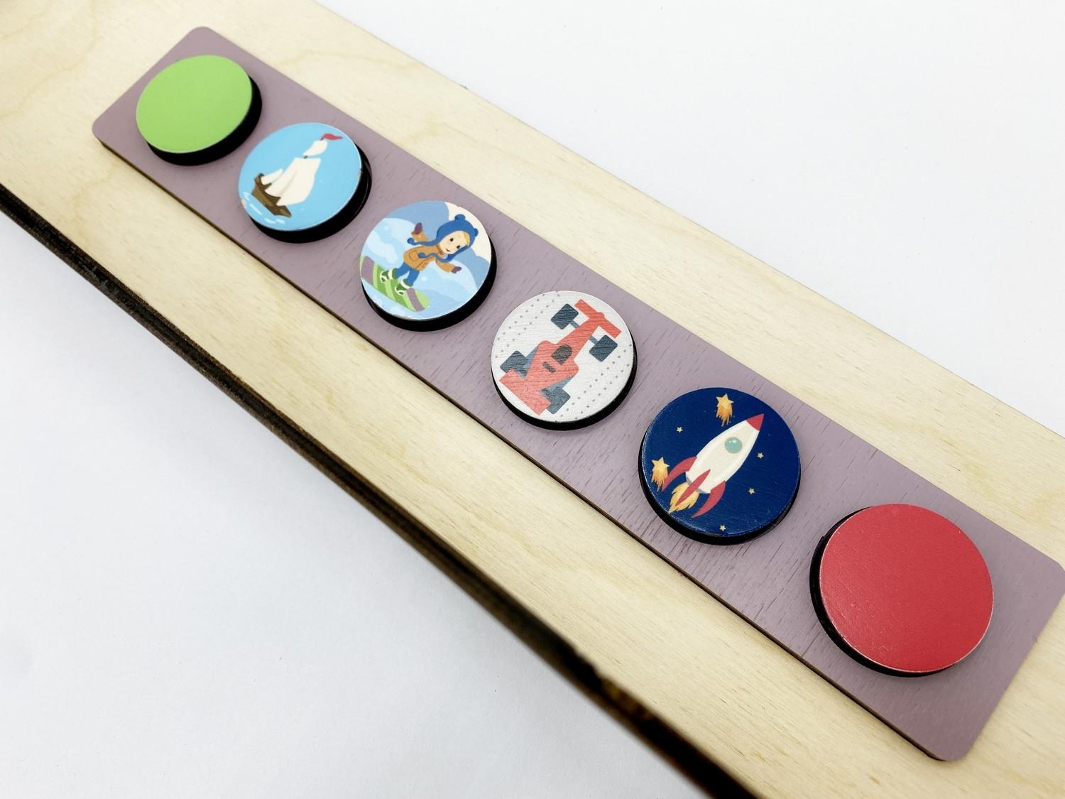 Внутри коробки на магнитах закреплены шесть фишек (две запасных): девочка на сноуборде, которой надо помочь покорить вершину; космический корабль, мечтающий вернуться на Землю; гоночная машина, которая должна прийти к финишу и парусный корабль, желающий первым добраться до сокровищ. На эти четыре тематики можно придумать столько увлекательных историй.