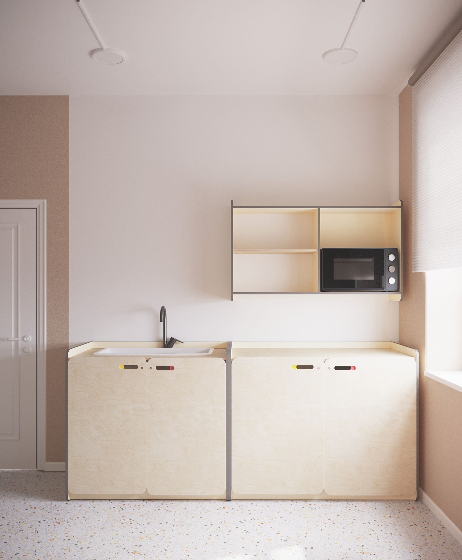 - Кухонный модуль с двумя дверцами и подвесными полками, оснащенный бытовой техникой (микроволновка и холодильник), позволяет быстро и удобно приготовить детское питание.