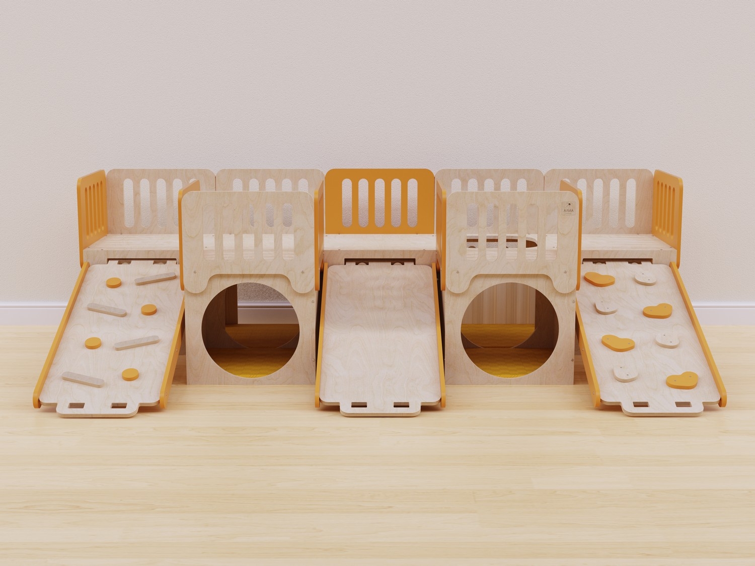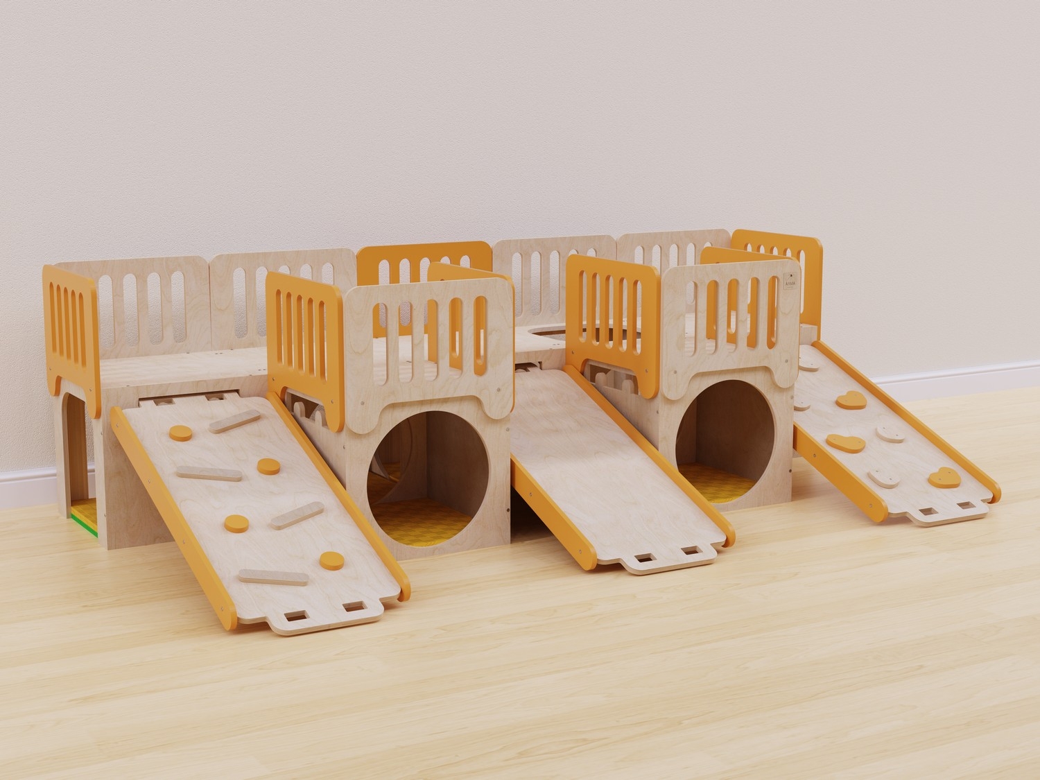 Каждый элемент конструкции соответствует актуальным ГОСТам на детскую мебель, требованиям СанПиН и пожарной безопасности, рекомендациям ФОП ДО по созданию развивающей среды для детей раннего возраста. Гладкие поверхности просты в уходе: достаточно влажной уборки для поддержания высокого уровня гигиены. Универсальный дизайн позволяет установить комплекс в любое пространство.
