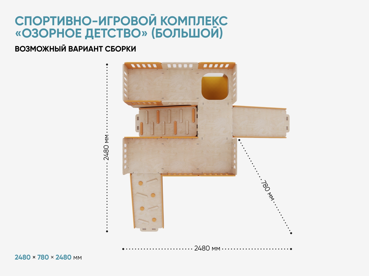 Габариты (ширина и глубина) игрового комплекса будут меняться в зависимости от ваших вариантов сборки. Высота комплекса всегда будет равна 780 мм.