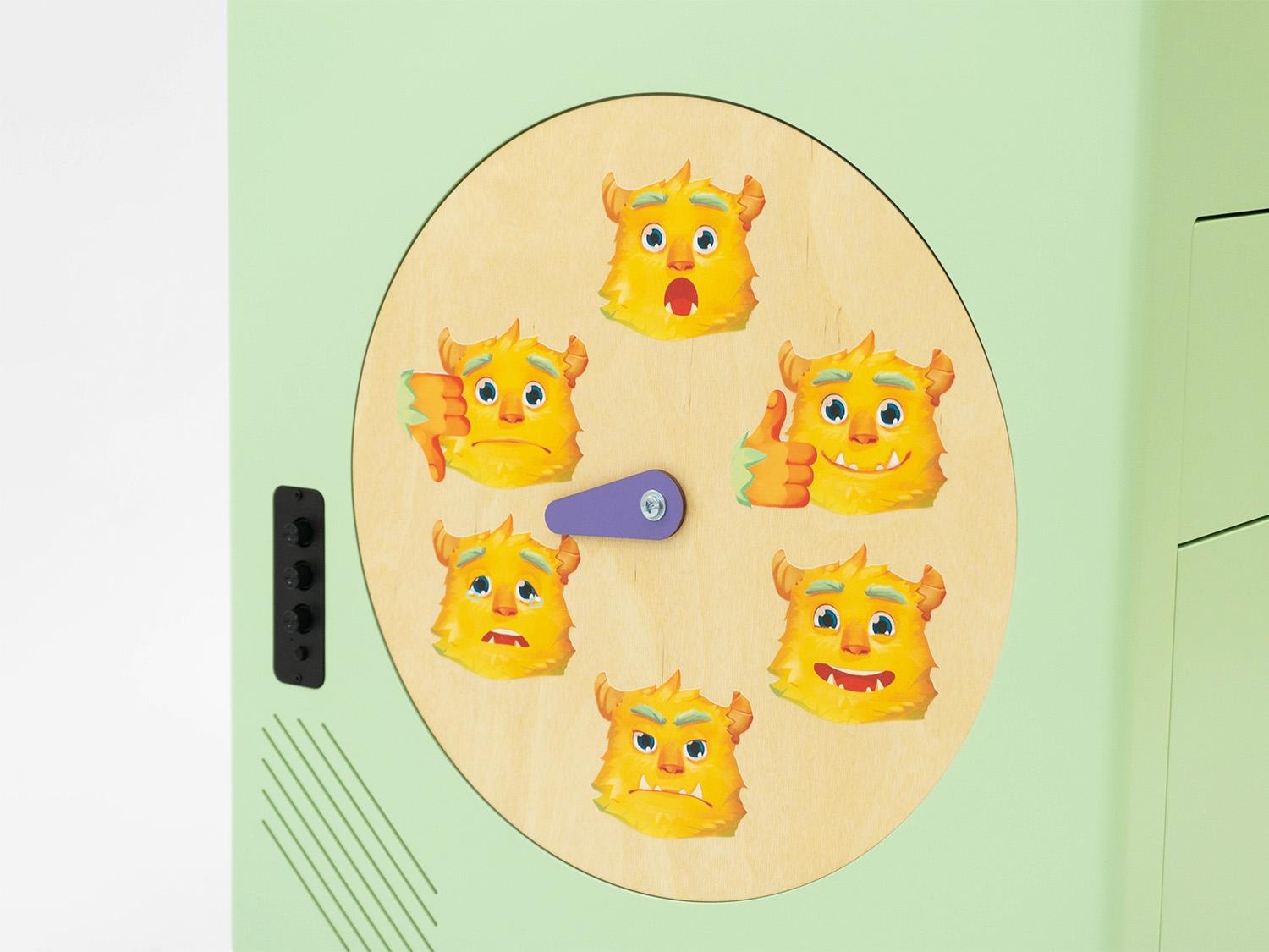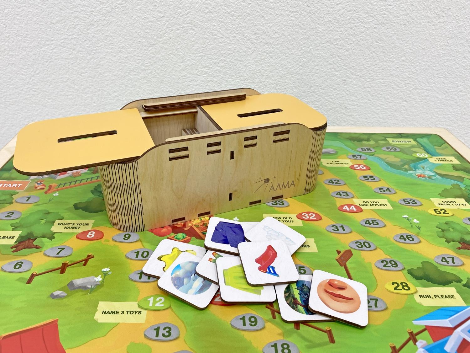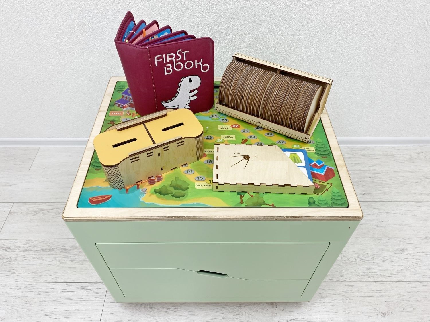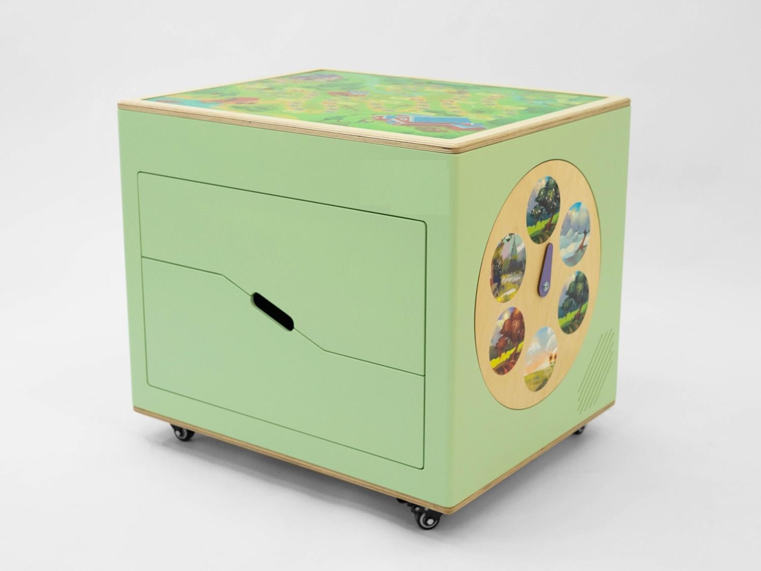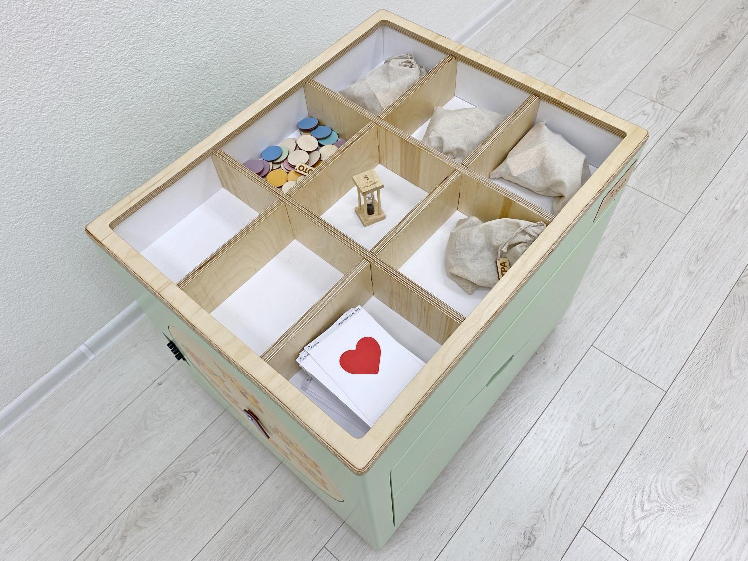 Мобильный куб на колёсиках может передвигаться в любое место класса, где детям удобнее заниматься, по бокам он оформлен бизибордами «Колесо настроения» и «Времена года», а сверху на крышке – красочная пошаговая игра-бродилка с вопросами на английском. Внутри в удобных ящиках спрятались: дидактические карточки, игра «Дубль», сортеры, пазлы, лото, домино, книга First Book.