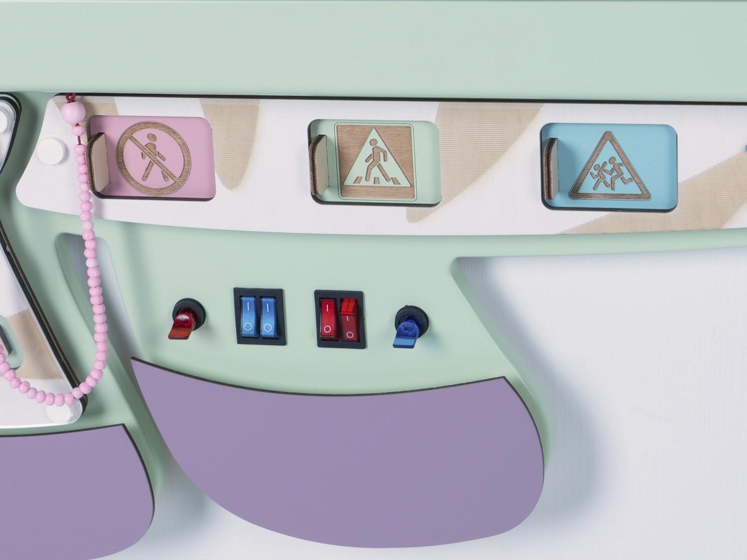 Сенсорные элементы разработаны с акцентом на правила дорожного движения. Оригинальные логические головоломки, кнопки, переключатели, счёты, шестерёнки и даже автомобильные скоростные приборы.