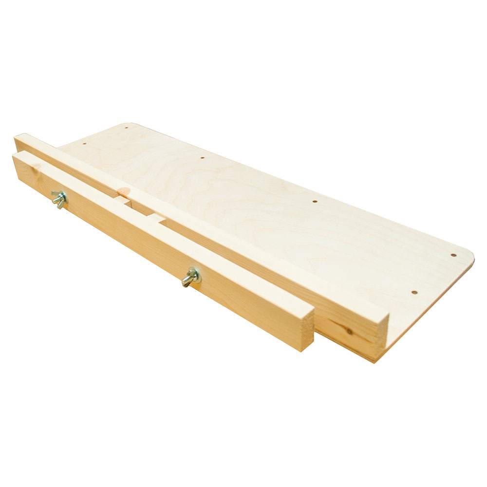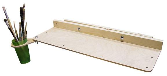 Основную плоскость полочки мы изготавливаем из 6 мм фанеры. Система фиксации к мольберту выполнена из соснового бруса. Управление прижимом осуществляется посредством металлической фурнитуры: мебельные болты М6, шайбы и гайки-барашки.