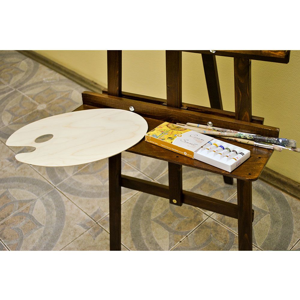 Стоит учесть, что плоскость дополнительной полочки расположена перпендикулярно к корпусу художественной подставки. И поскольку корпус предполагает наклон, то и Поллада тоже устанавливается не абсолютно горизонтально к полу, а с небольшим наклоном в сторону мольберта.