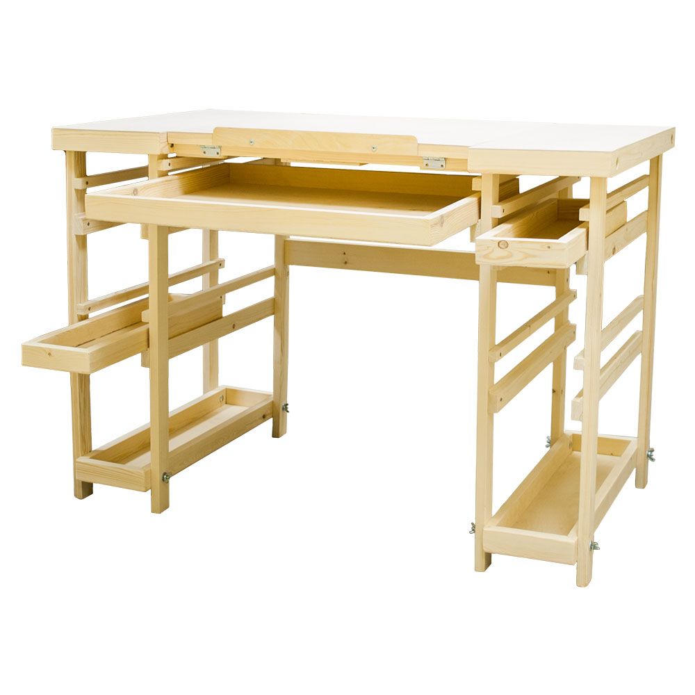 Боковые столики позволяют размещать необходимые для работы инструменты. Выдвижные ящики и полочки позволят хранить значительное число ваших творческих принадлежностей в одном месте.