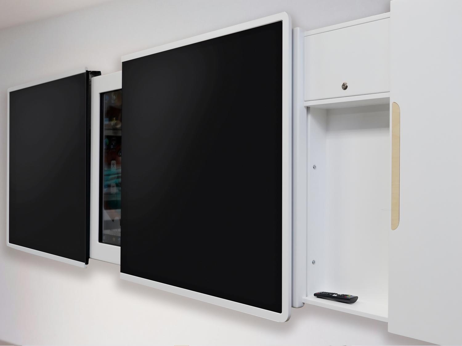 6. Удобство и эргономичность конструкции. Раздвижная система створок имеет прочную конструкцию и плавный ход благодаря доводчикам. По бокам интерактивной раздвижной доски находятся закрытые секции с полочками, где удобно хранить обучающий материал, маркеры, губки, пульты управления и прочий инвентарь. Запирающаяся на ключ секция, куда можно убрать ноутбук преподавателя, становится доступна при максимальном сдвигании двух досок в противоположную от секции сторону.