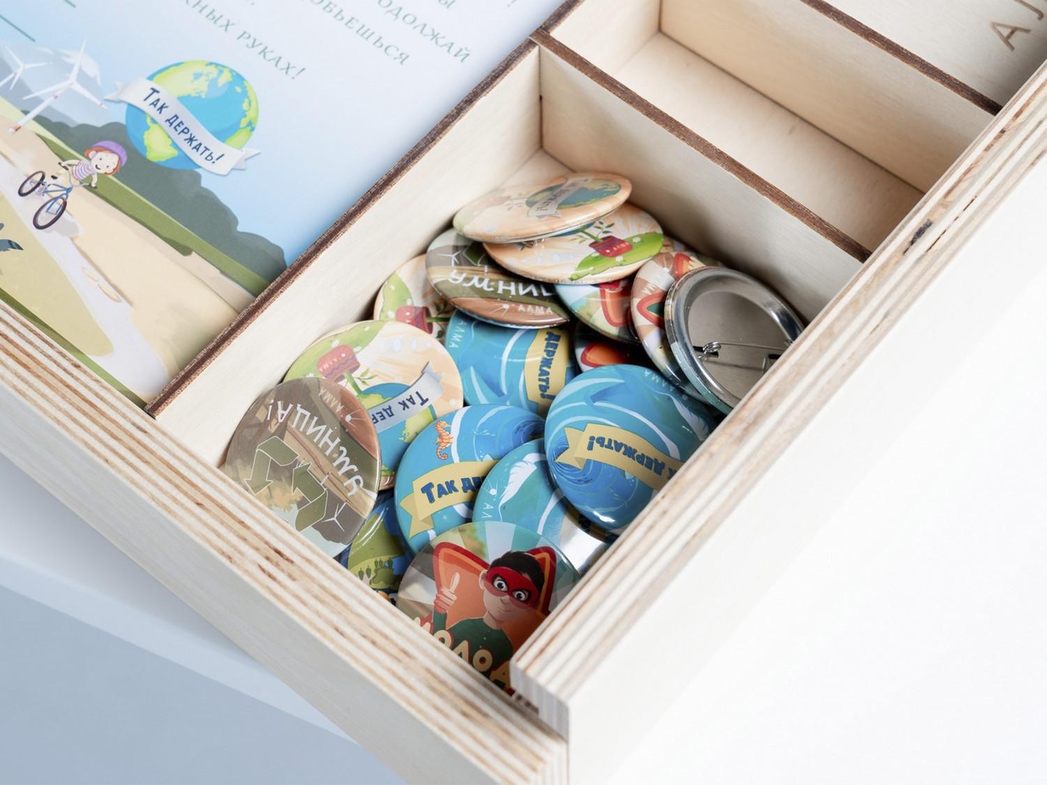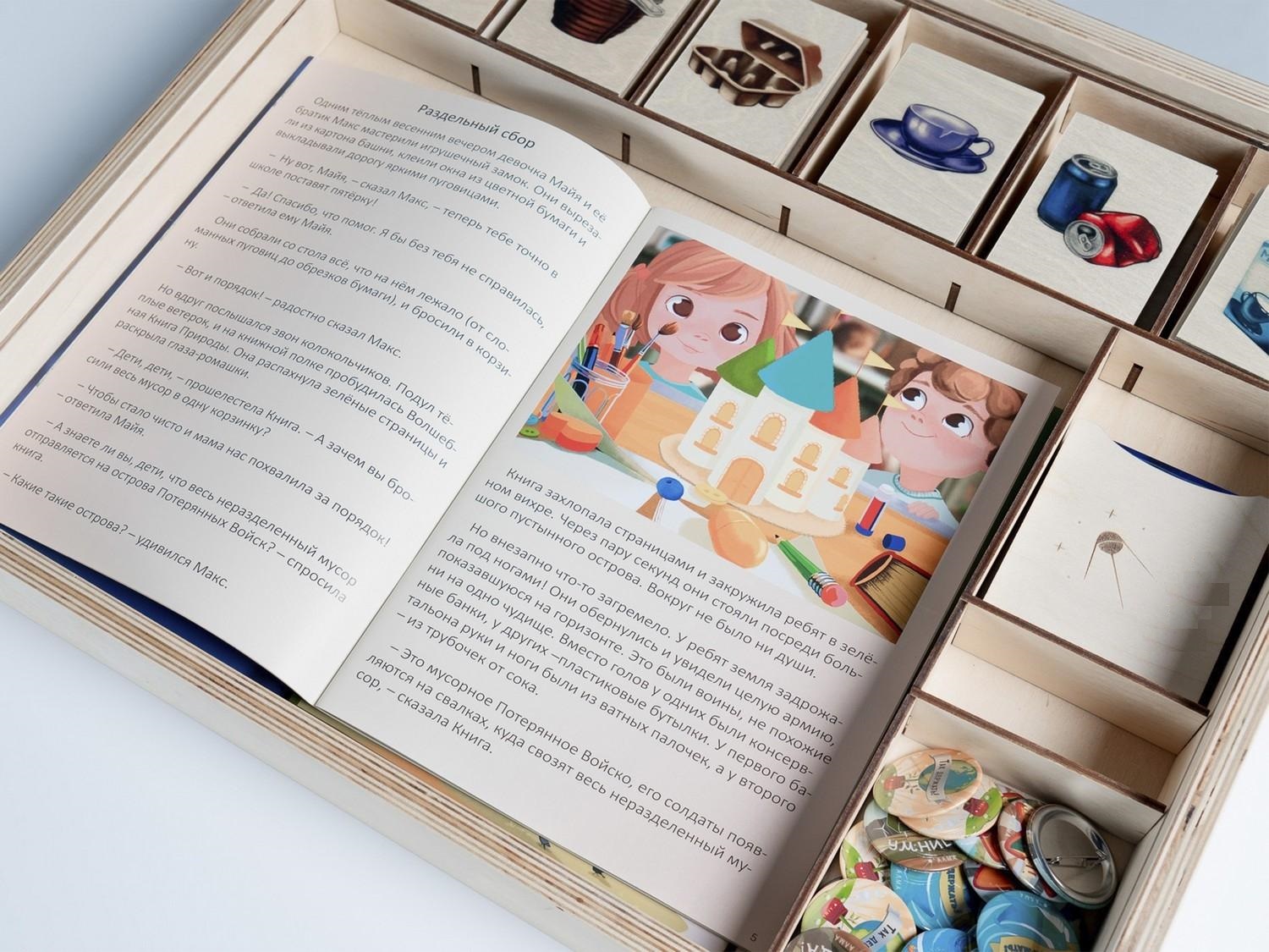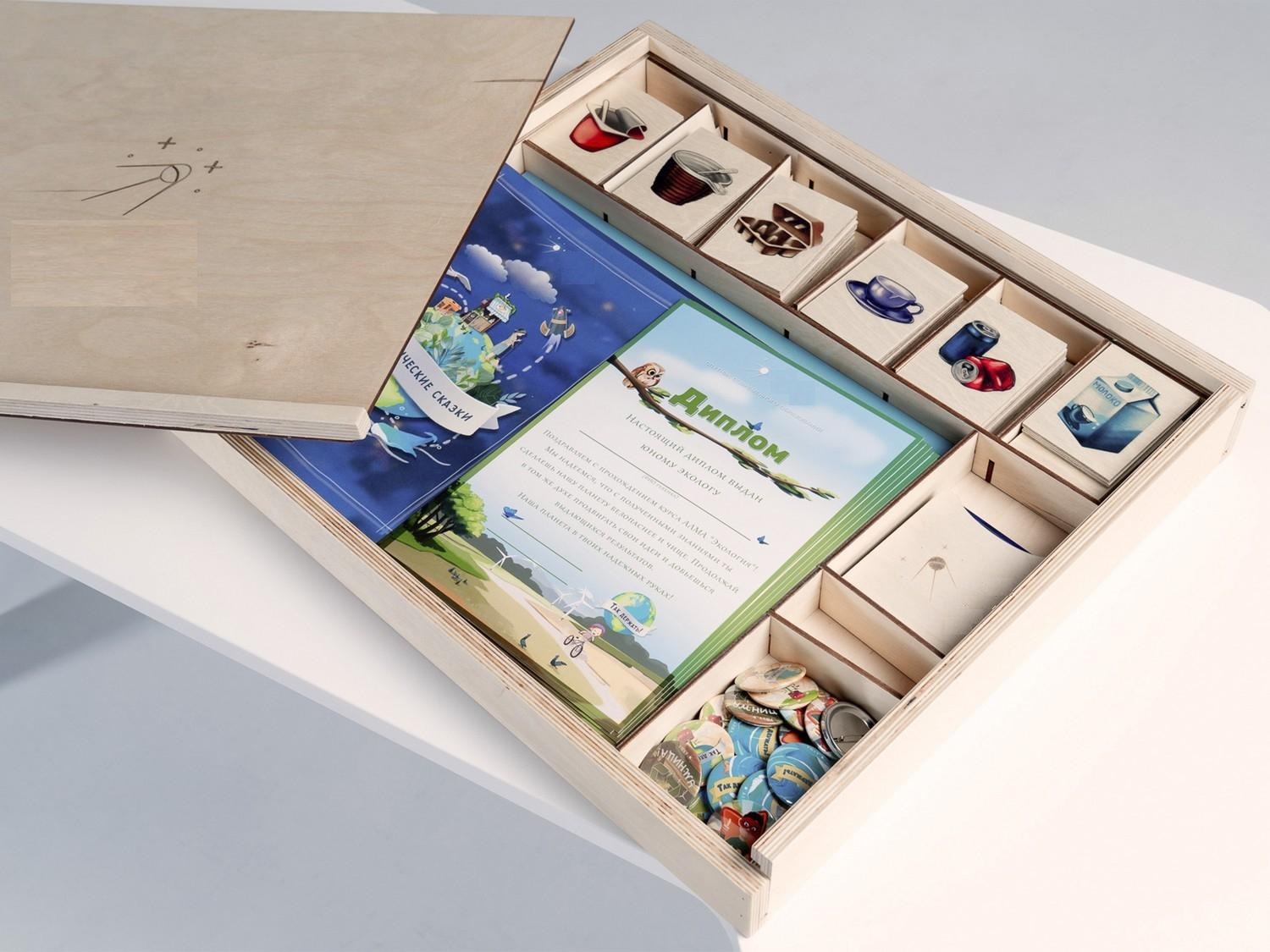 «Экология» — это художественно оформленная сенсорная панель с программным обеспечением, а также мотивационные значки и дипломы «Юного эколога», сборник экологических авторских сказок, тематические плакаты и комплект деревянных контейнеров, комплект игральных карточек для «сортировки мусора», карточки для проведения викторины.