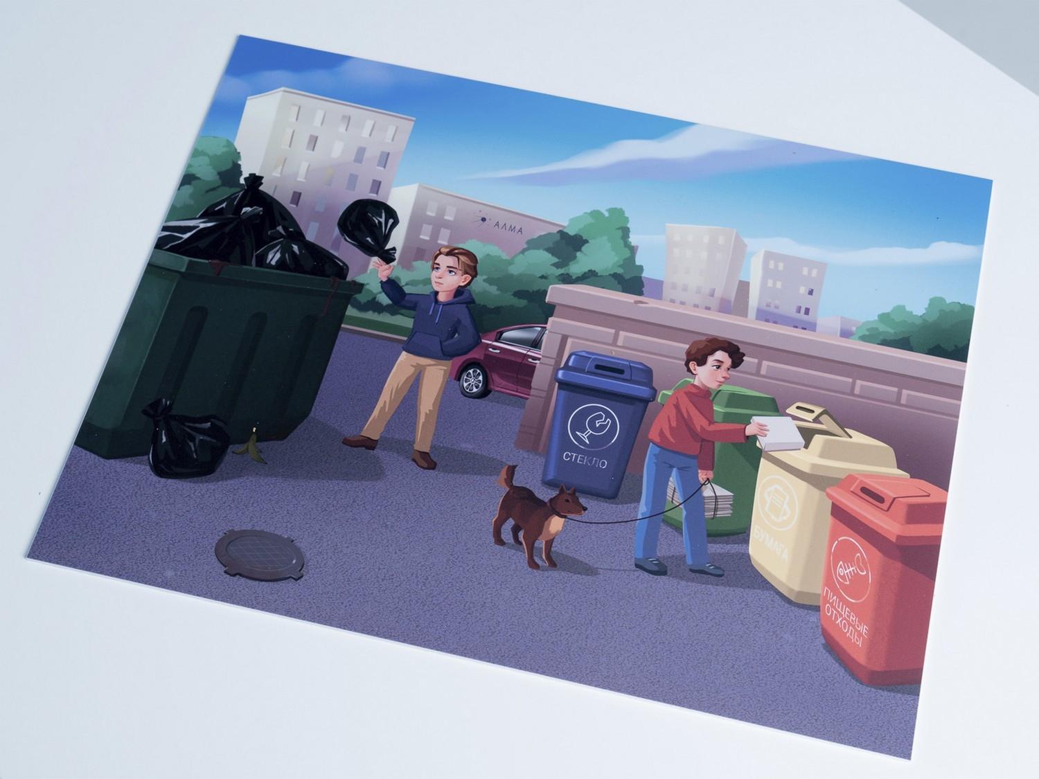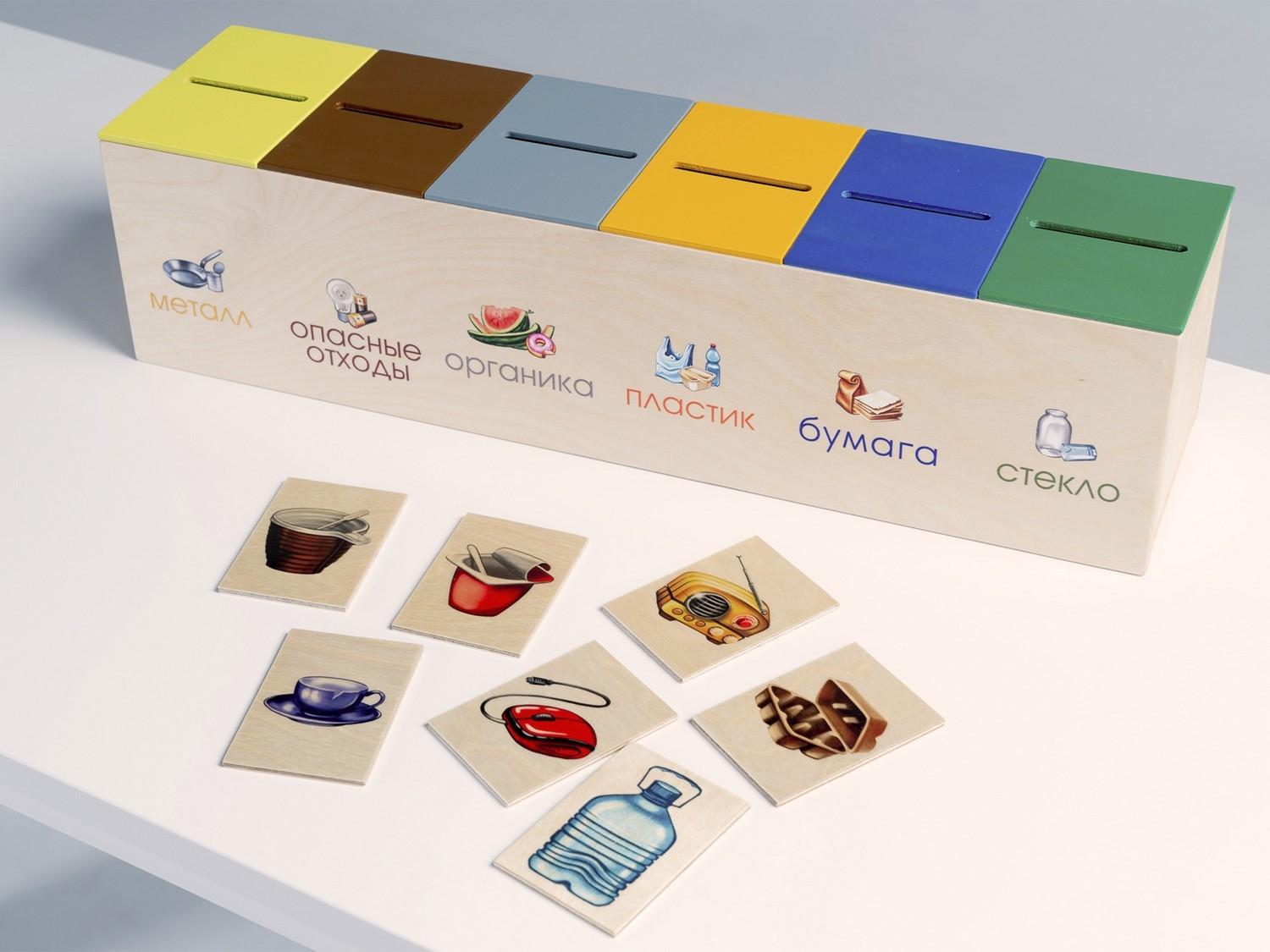 - Дидактическая игра по сортировке мусора: комплект контейнеров для сортировки разного типа мусора, карточки с изображением мусора – 60 шт.
