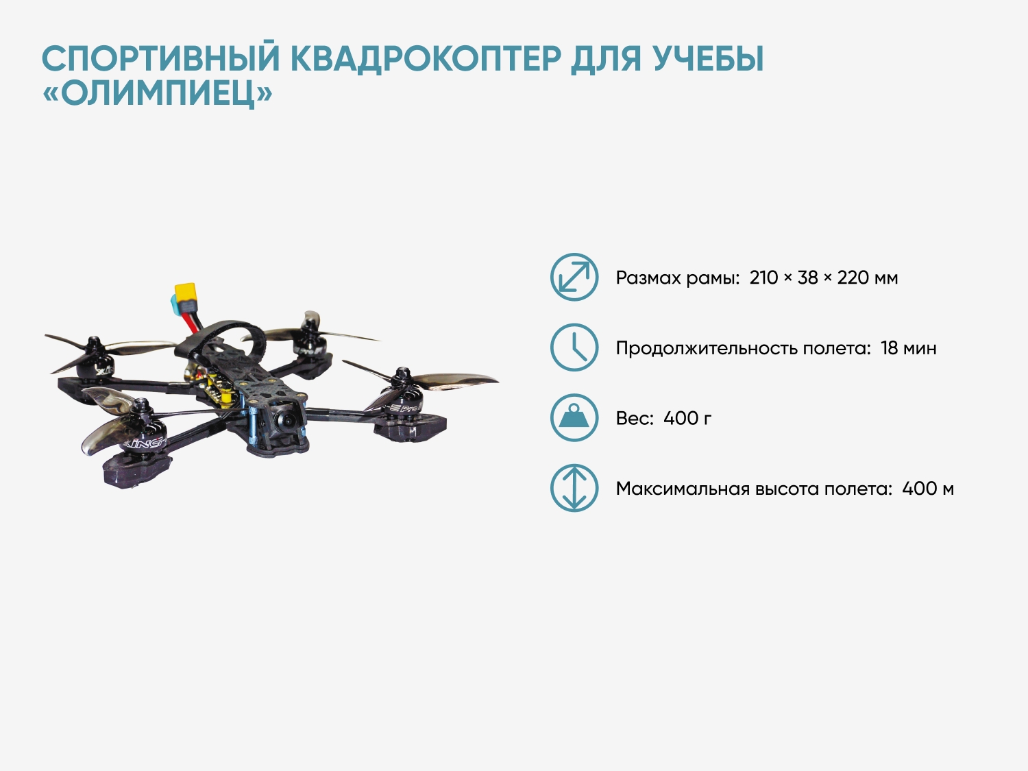 Конструктор спортивного квадрокоптера «Олимпиец» предназначен для развития ранней профориентации в области конструирования, сборки и FPV-пилотирования беспилотных летательных аппаратов мультироторного типа в общеобразовательных организациях для детей от 12 лет.