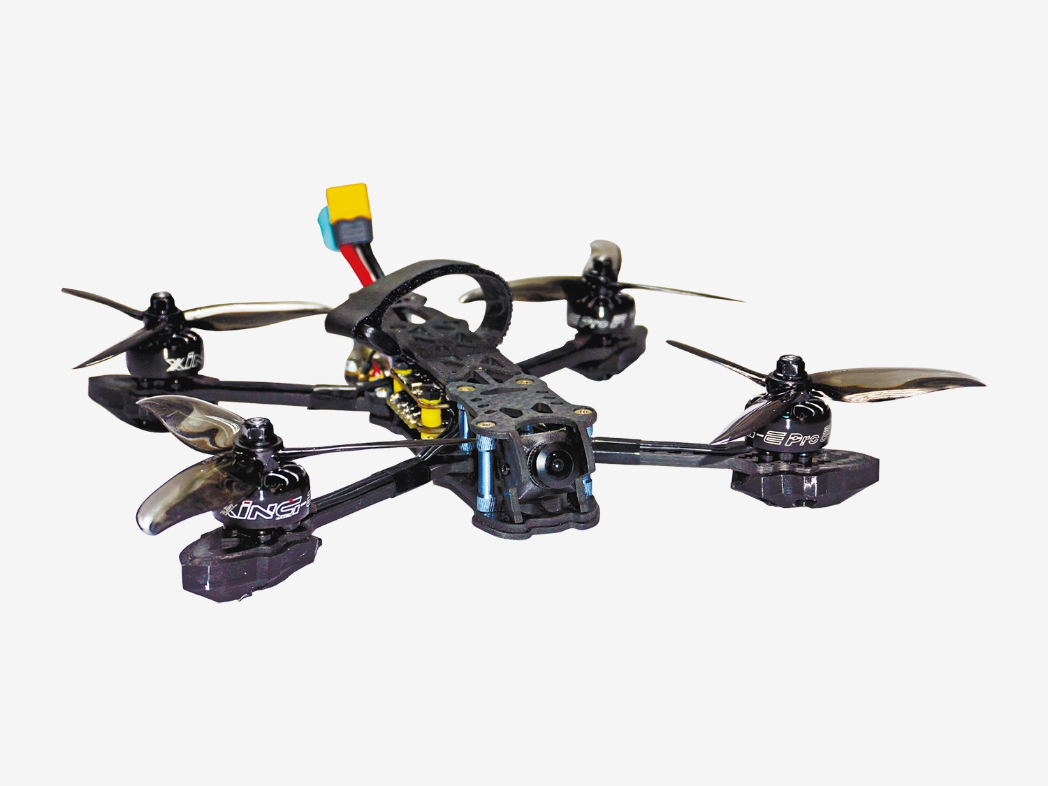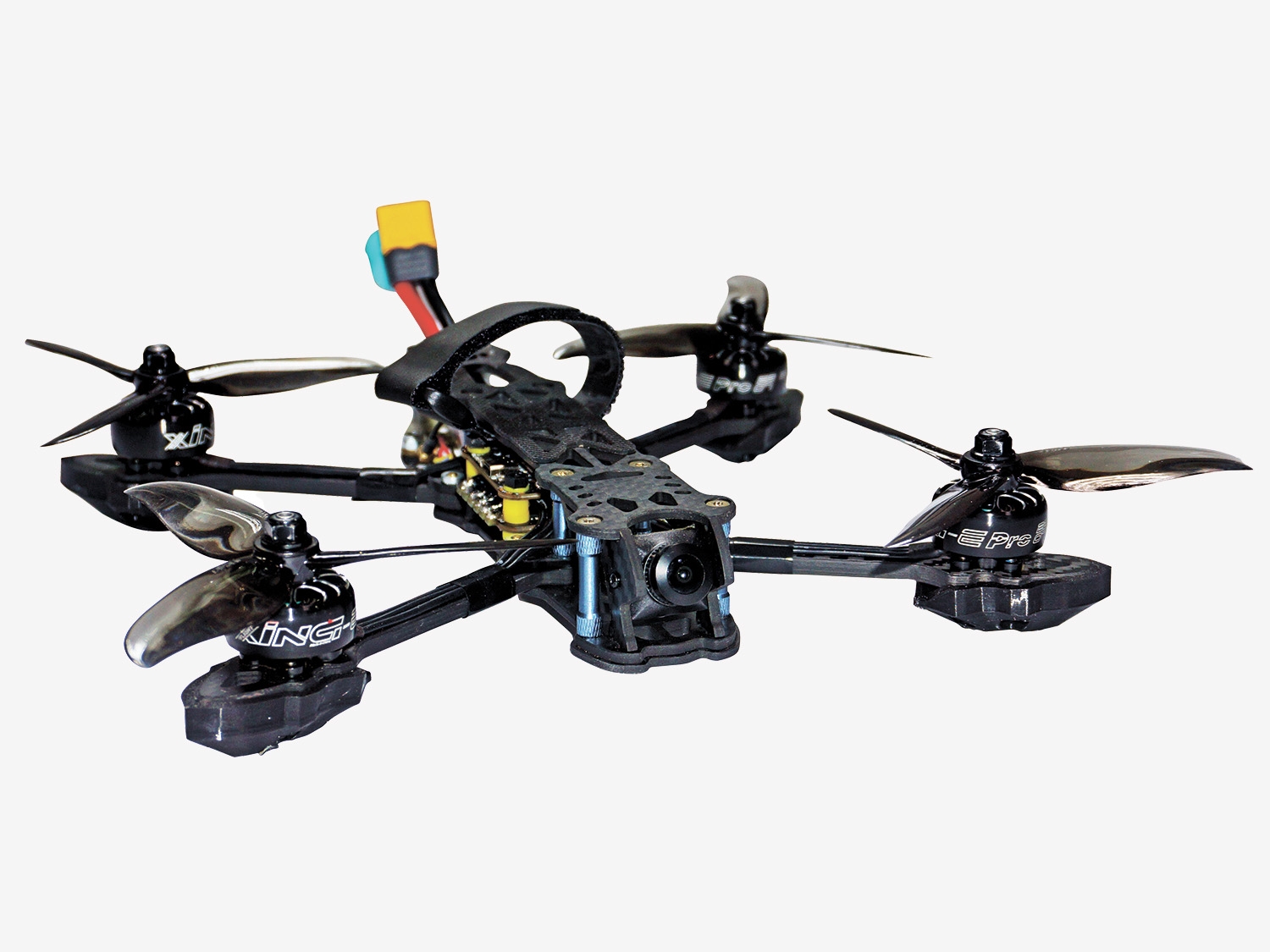 - крепость конструкции рамы (карбон и пластик) позволяет выдерживать значительные нагрузки при скоростном пилотировании, обеспечивает лучшую управляемость и сохраняет дрон при падении или столкновении с препятствием;