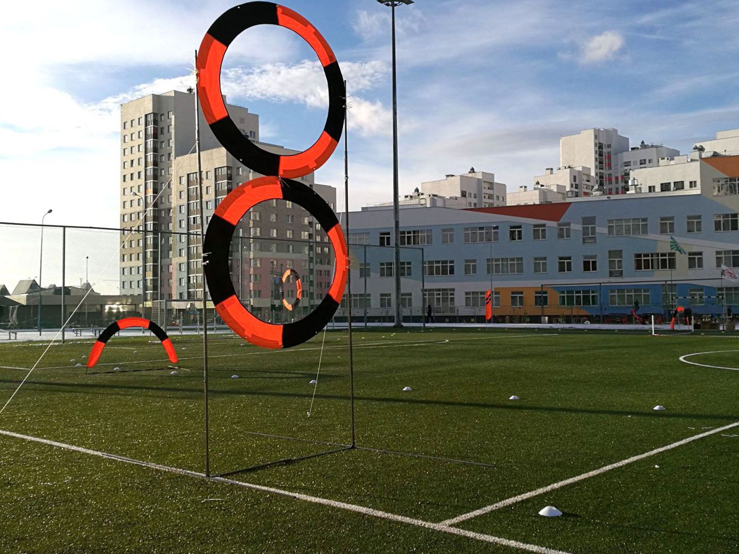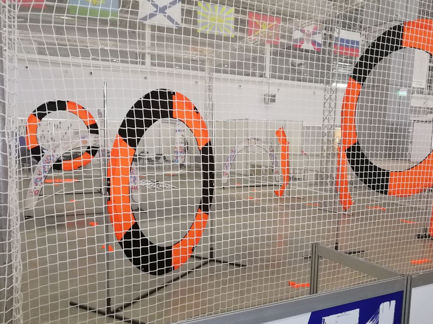Трасса для проведения соревнований по дрон-рейсингу, включающая в себя поворотные флаги, курсовые ворота, площадку для взлета-посадки, подвесные кольца, систему автоматической фиксации пролетов.