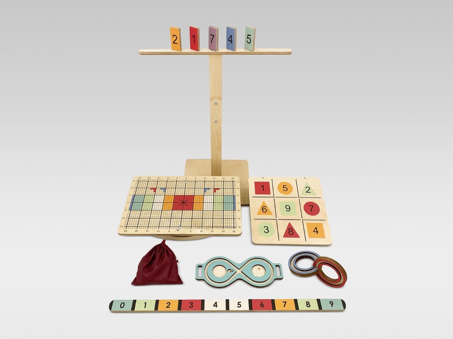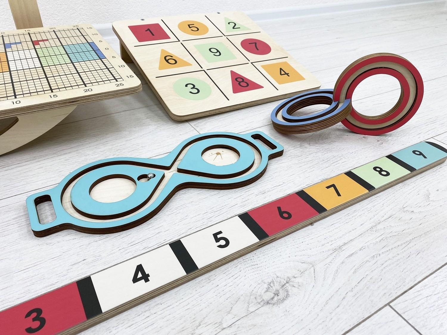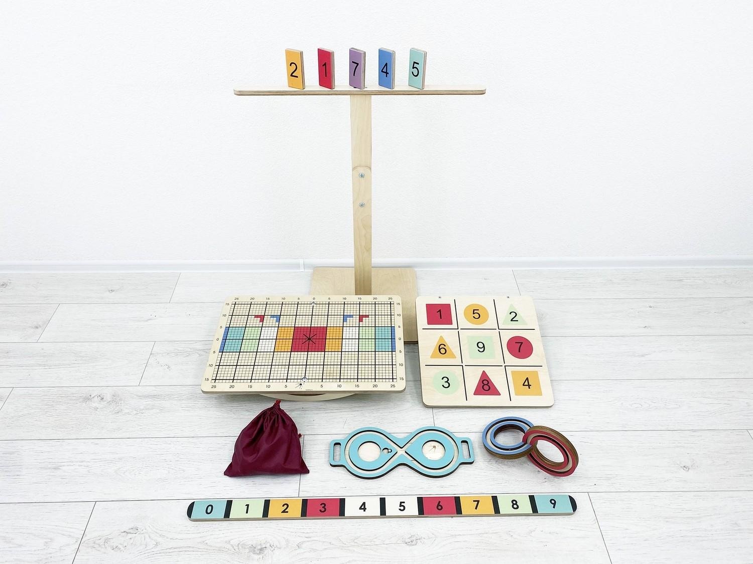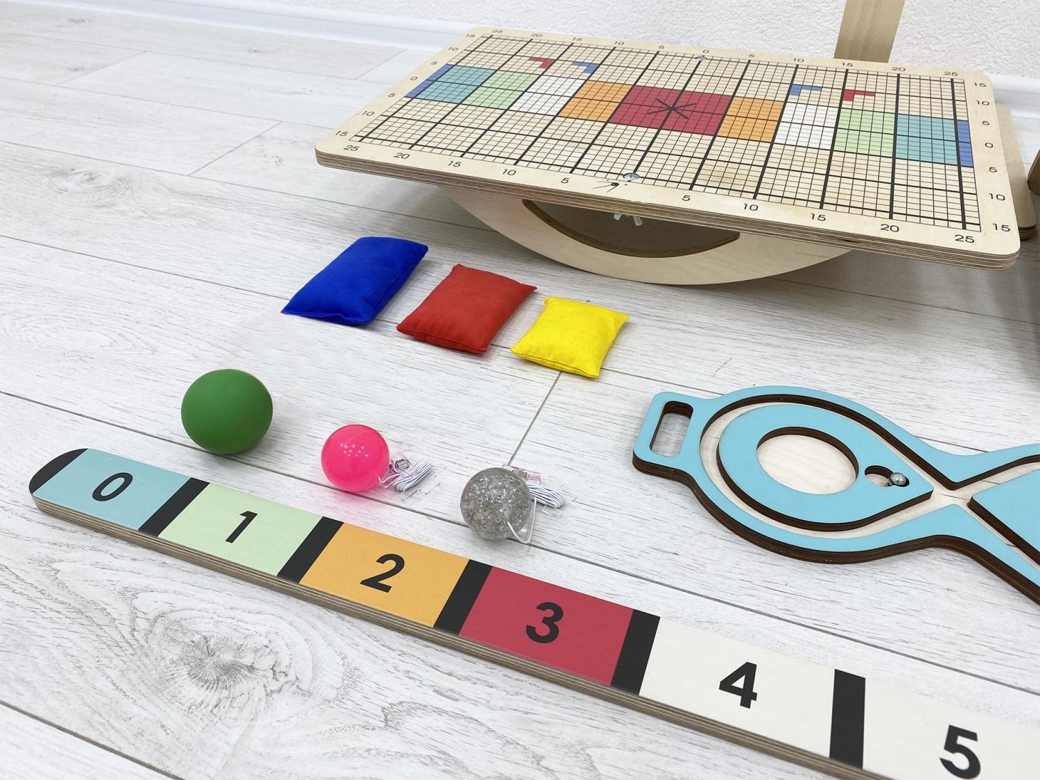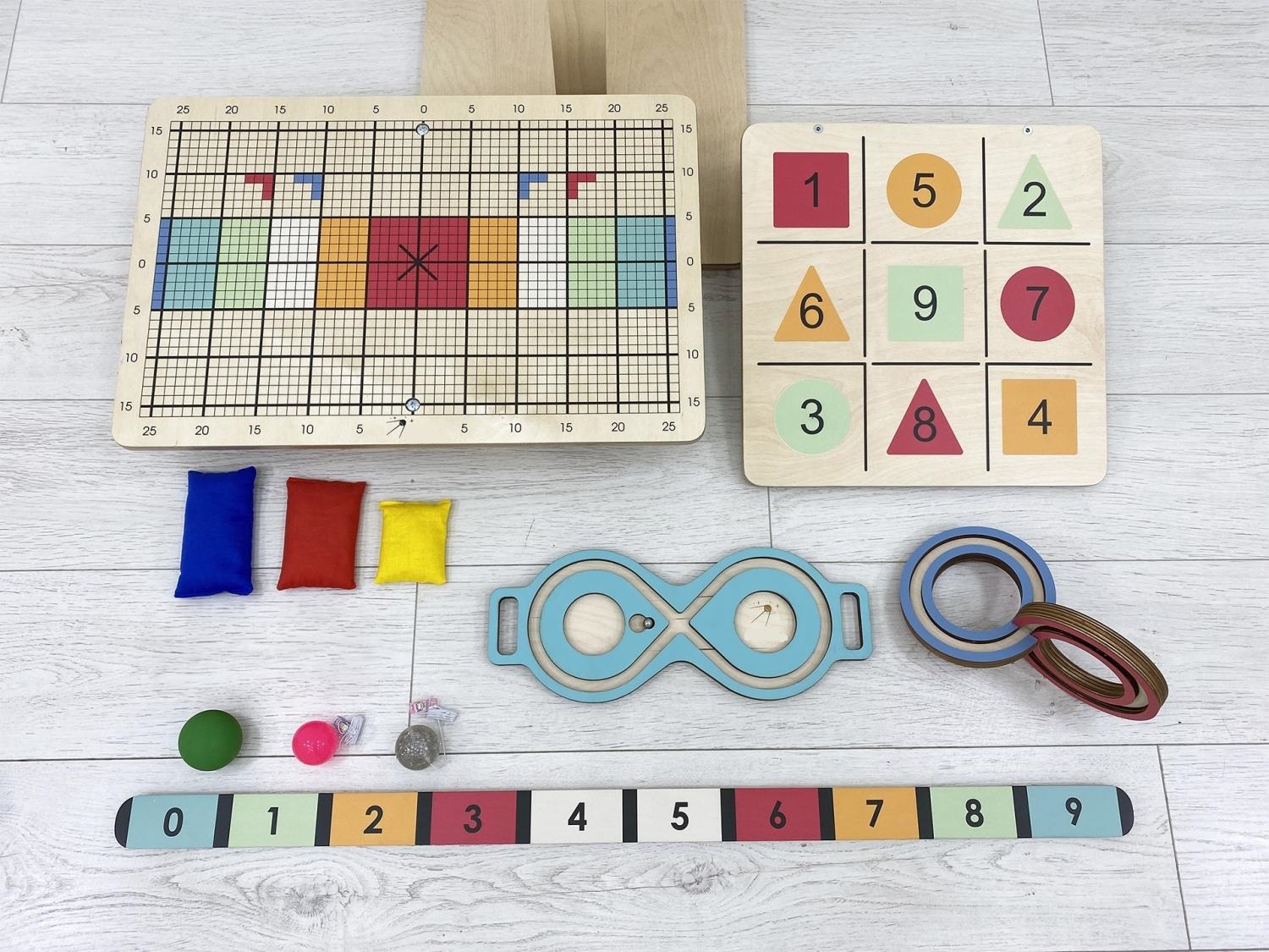 Комплект состоит из оригинальной доски Бильгоу с дополнительным инвентарём и тренажёров для развития мозга – нейровосьмёрки и 3D-восьмёрки. Он подходит для оборудования кабинета детского психолога, логопеда, физиотерапевта.