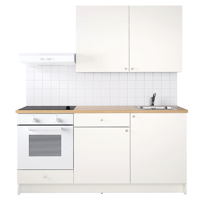 В гарнитуре предусмотрено место для плиты, раковины и вытяжки. В нижней части вы можете расположить кухонную утварь и посуду. В подвесных шкафах будет удобно хранить сыпучие продукты и мелкие принадлежности для готовки.